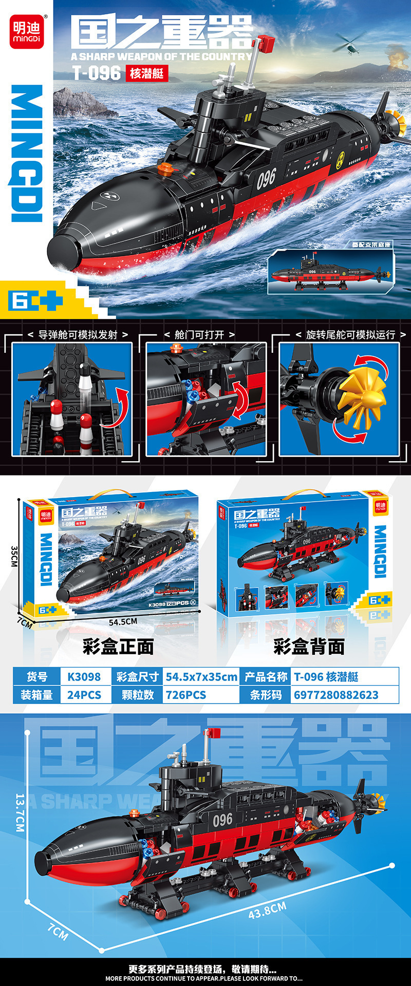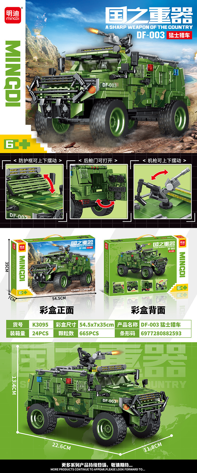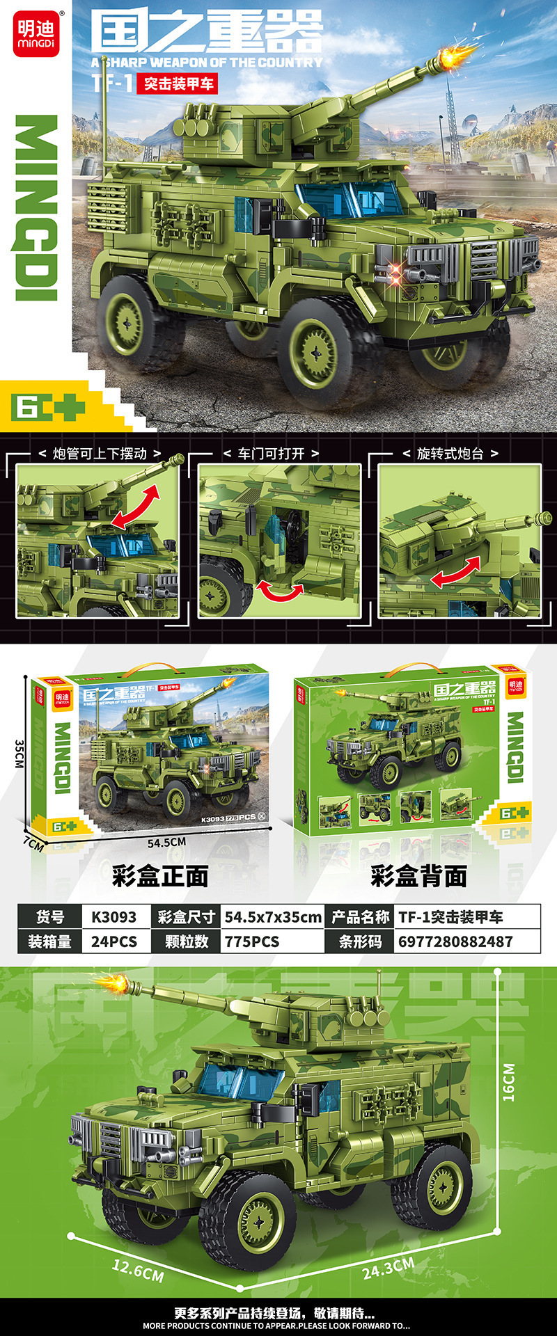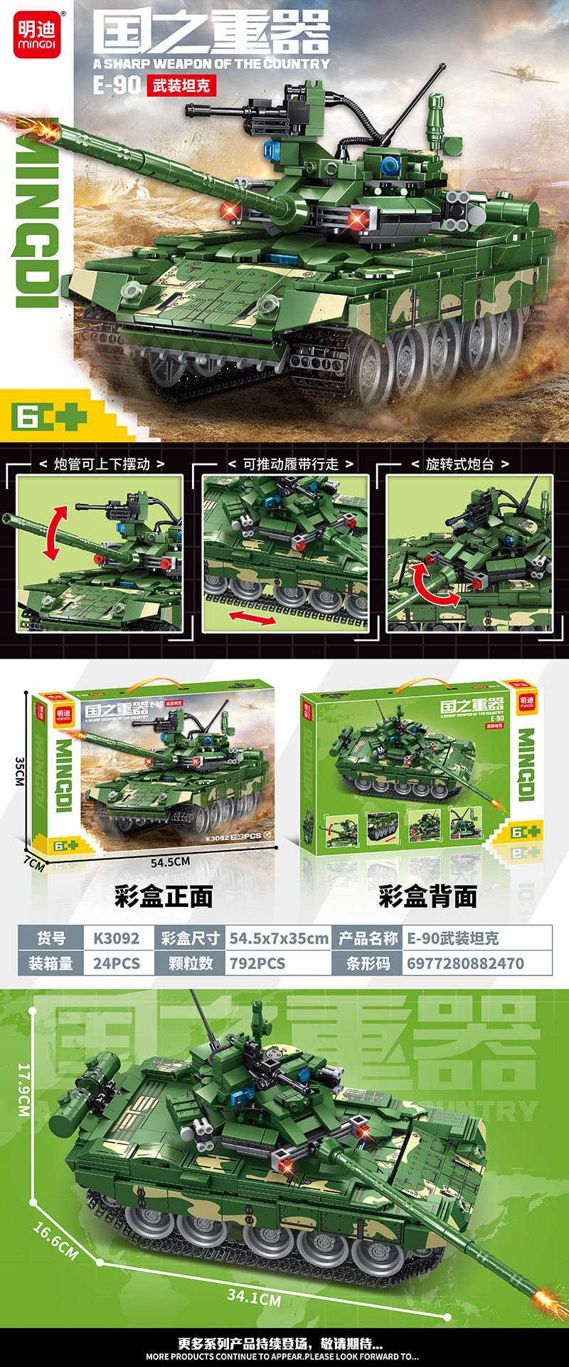 K3091 陆战坦克(大盒),K3092 武装坦克(大盒),K3093 突击装甲车(大盒),K3094 苏33战斗机(大盒),K3095 猛士猎车(大盒),K3096 WZ-E1战斗机(大盒),K3097 装甲突击车(大盒),K3122 901型远洋补给舰(大盒),K3123 076型两栖攻击舰(大盒),K3124 空警600预警机(大盒),K3129 战斗轰炸机(中盒),K3130 UH-60U黑鹰直升机(中盒),K3131 054B型导弹护卫舰(中盒),K3132 VN22轮式装甲车(中盒),K3133 直20武装直升机(中盒),K3134 攻击-II无人机(中盒),K0881 红旗导弹车(中盒),K0882 长剑-10巡航导弹车(中盒),K0883 龙骑兵装甲车(中盒),K0884 自行高炮(中盒),K0885 99式主战坦克(中盒),K0886 094核潜艇(中盒),K0887 战斗机(中盒),K0888 山东舰(中盒),K0890 福建舰(中盒),K0891 6K轰战机(中盒),K0892 悍马(中盒),K0893 导弹驱逐舰(中盒),K0680 红旗2对地导弹车(中盒),K0681 猎鹰突击旋翼机(中盒),K0682 东风17导弹车(中盒),K0683 导弹运载车(中盒),K0917 S-230战斗机(中盒),K0918 MK-35战斗机(中盒),K0919 H-100轰炸机(中盒),K0921 WIE-25截击机(中盒),K0922 H-15战斗机(中盒),K0923 A-61概念机(中盒),K0924 G-20六代机(中盒),K0925 H-JI6轰炸机(中盒),K3125 东风猛士指挥车(中盒),K3126 HQ-6A 防空导弹车(中盒),K3127 BMP-1 装甲车(中盒),K3128 89式1221MT 自行火箭炮(中盒)