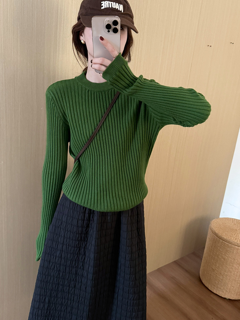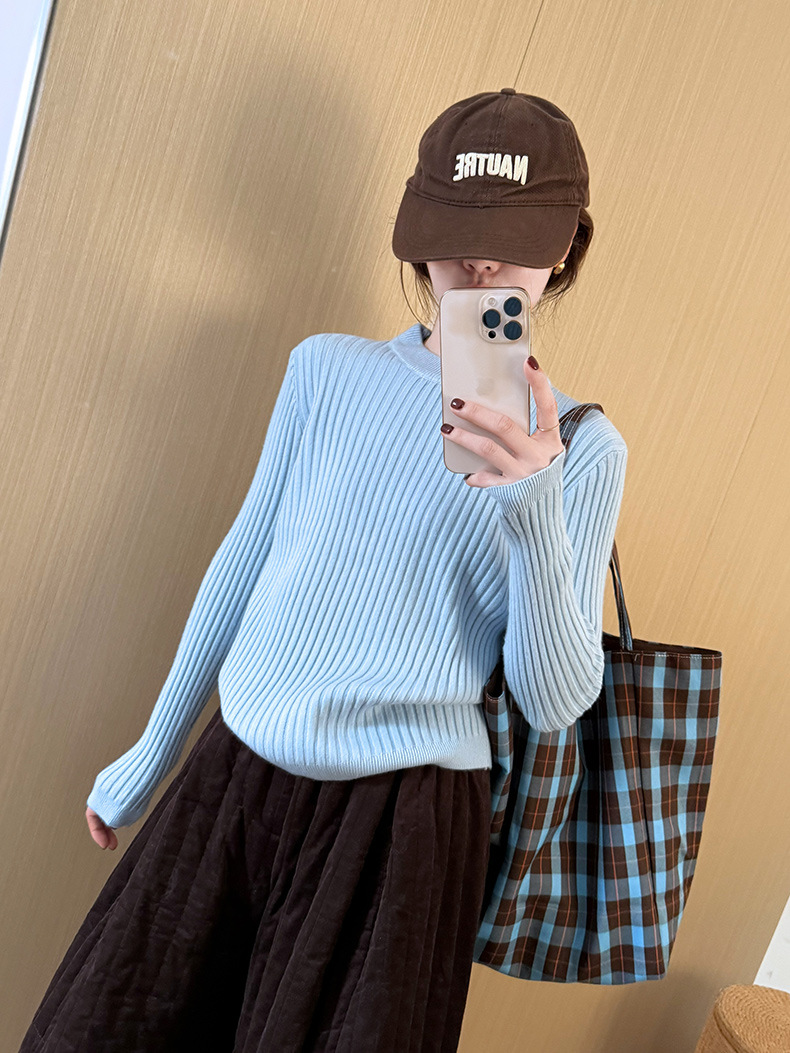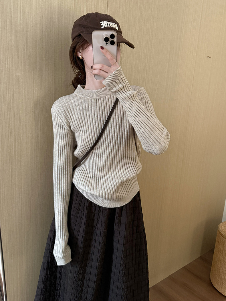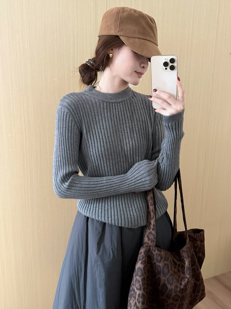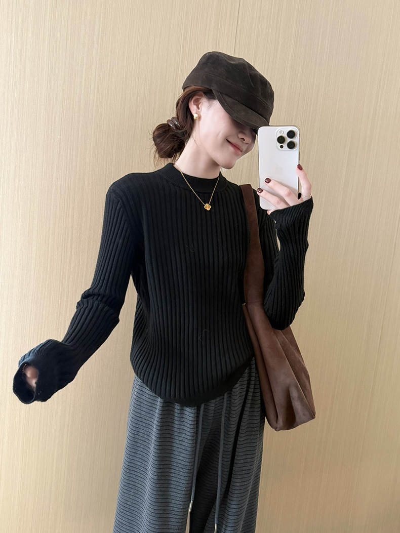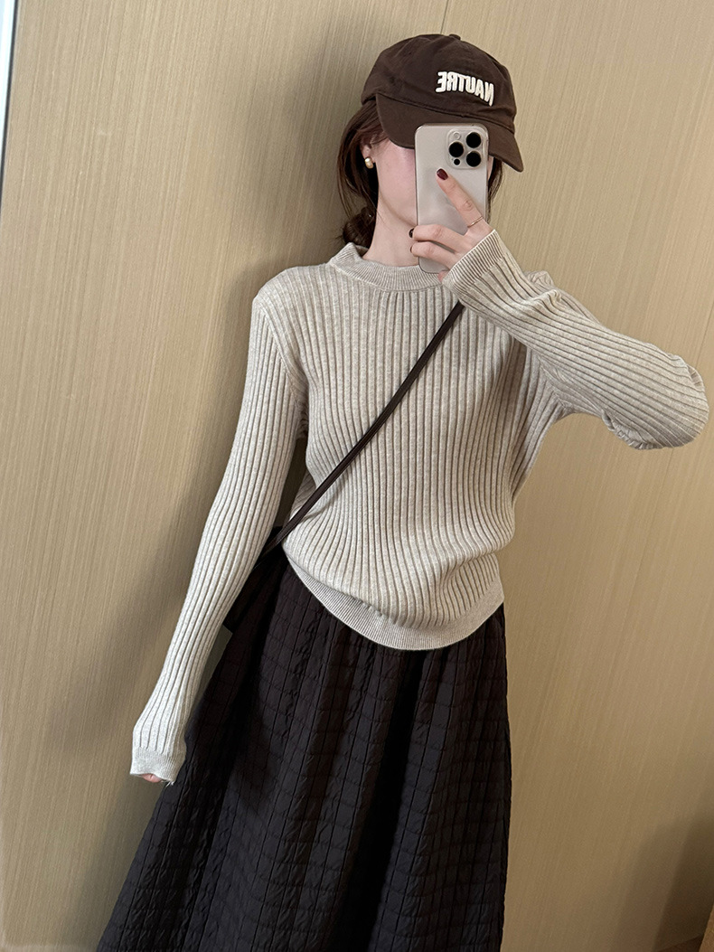 秋冬别致坑条圆领修身内搭长袖针织打底衫女简约显瘦百搭毛衣上衣