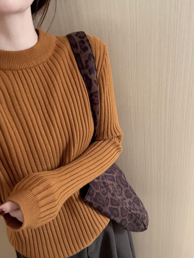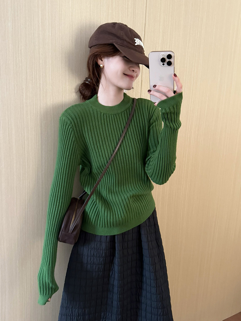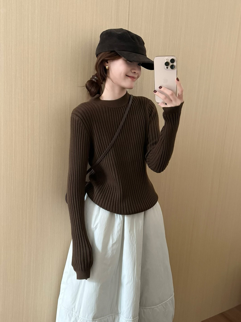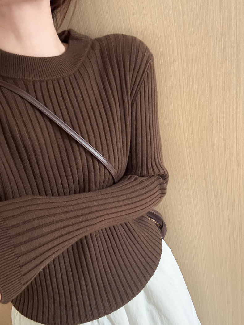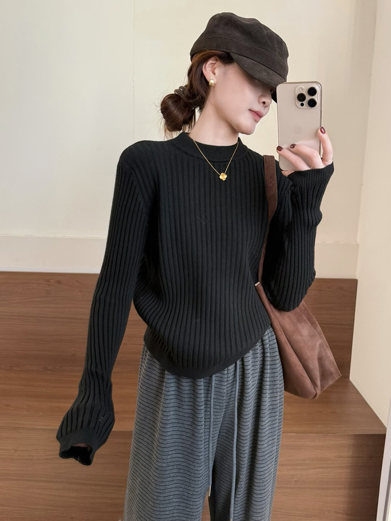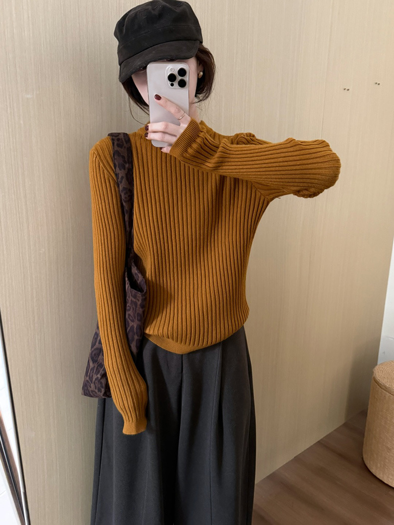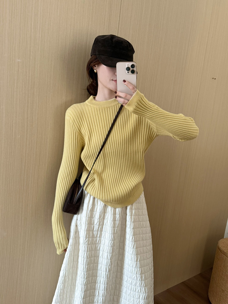 秋冬别致坑条圆领修身内搭长袖针织打底衫女简约显瘦百搭毛衣上衣