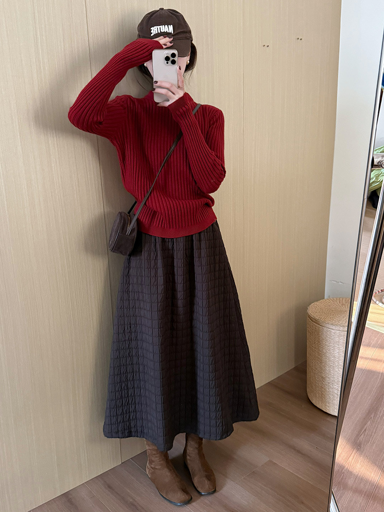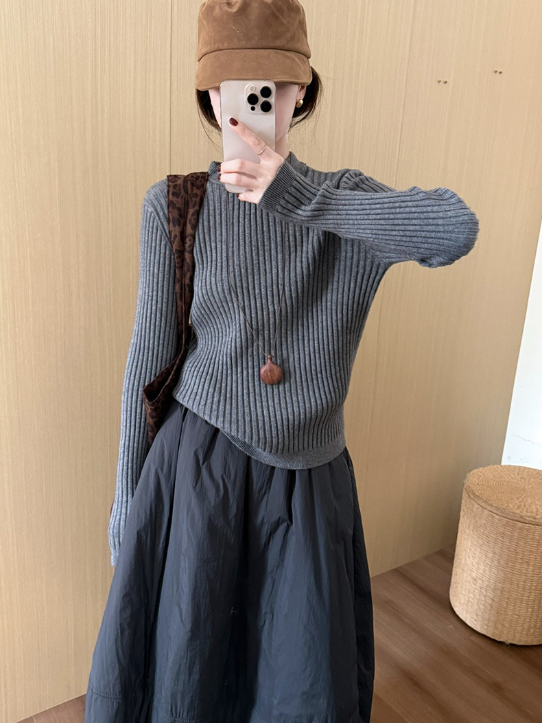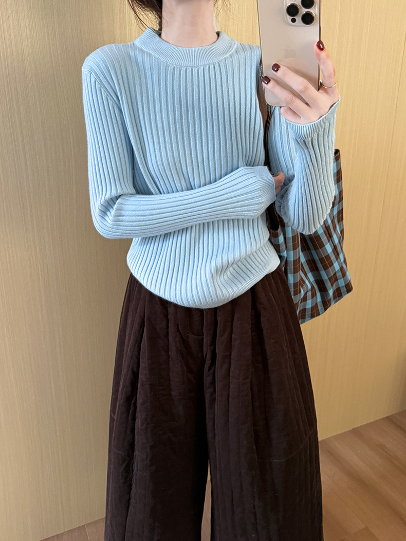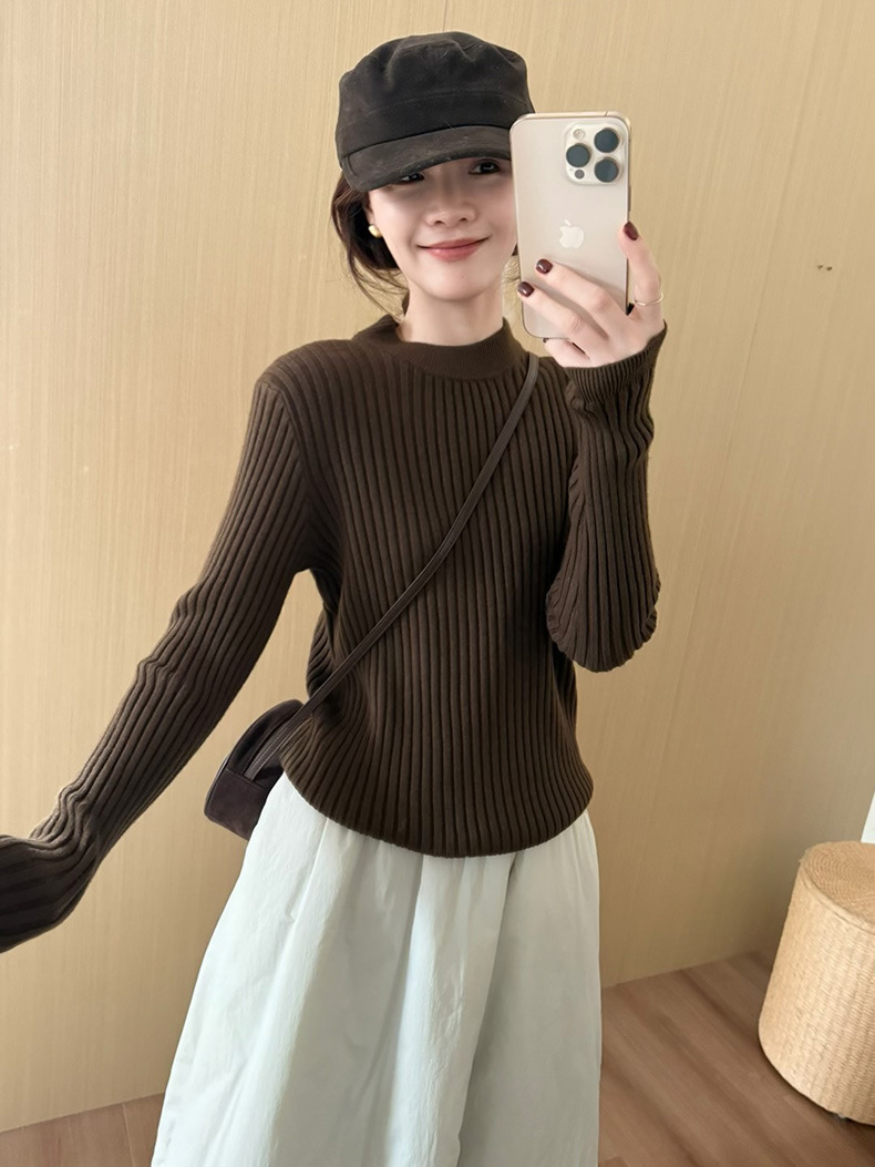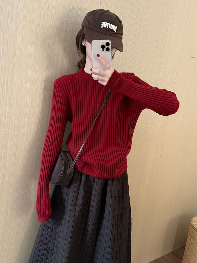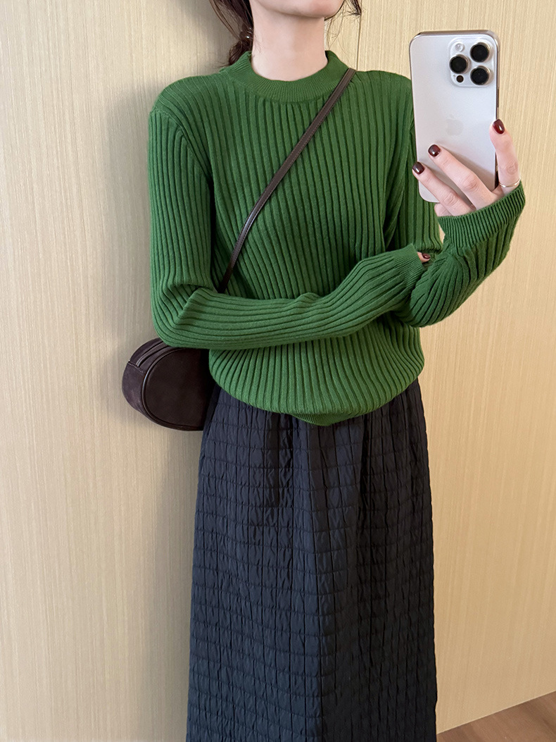 秋冬别致坑条圆领修身内搭长袖针织打底衫女简约显瘦百搭毛衣上衣