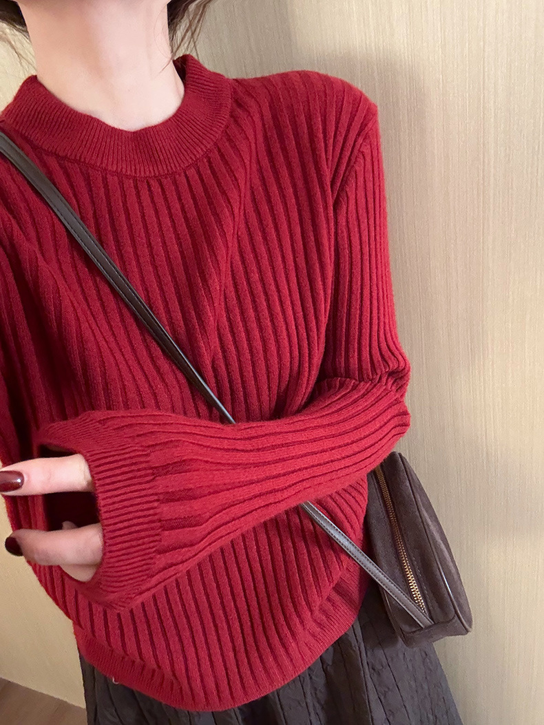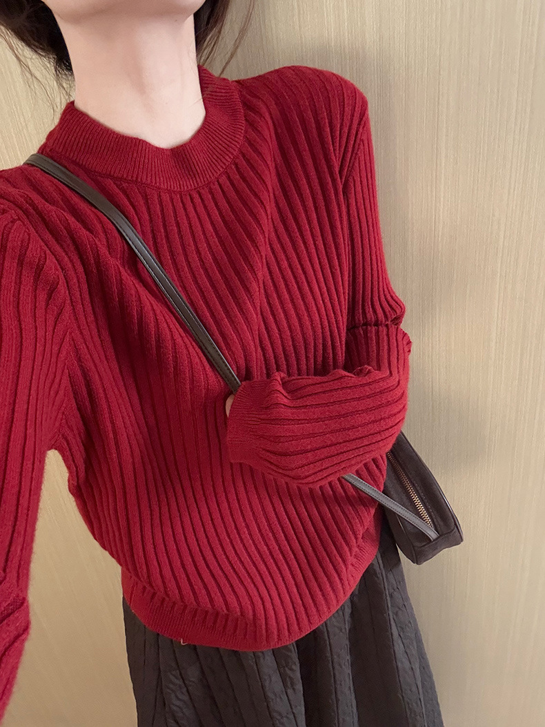 法式气质长袖针织衫2026洋气修身复古显瘦早春打底衫领红色毛衣女