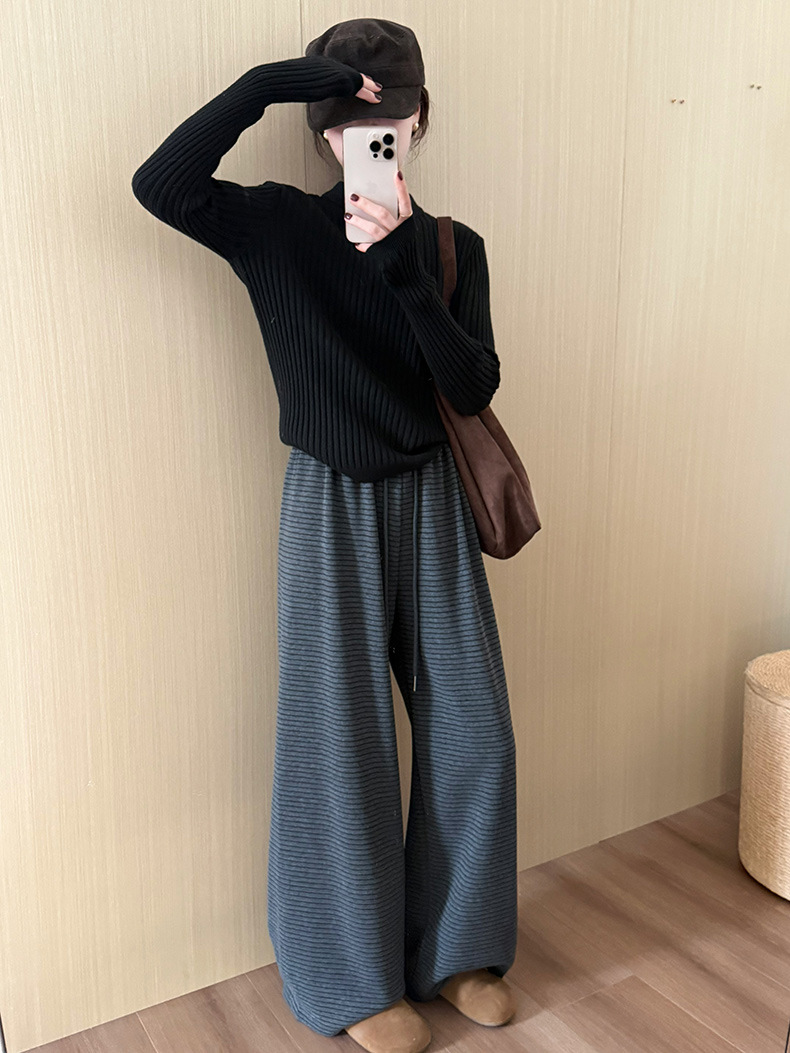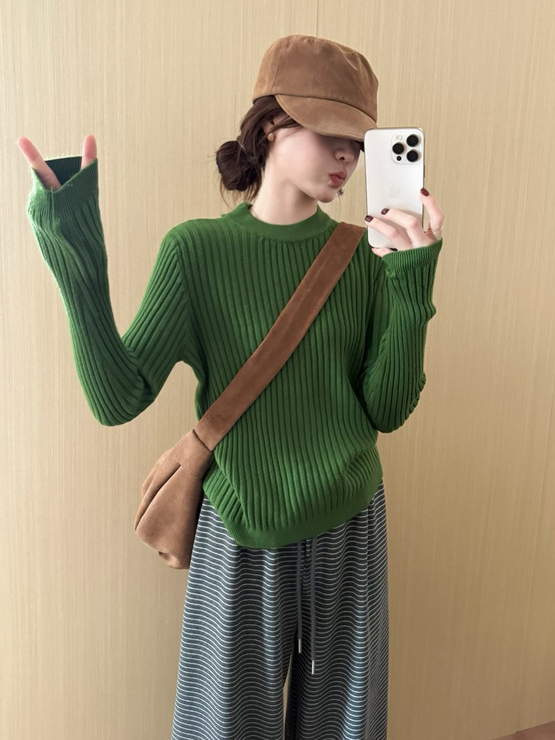 圆领坑条针织打底衫女2025冬季新款韩版宽松套头毛衣复古针织衫女