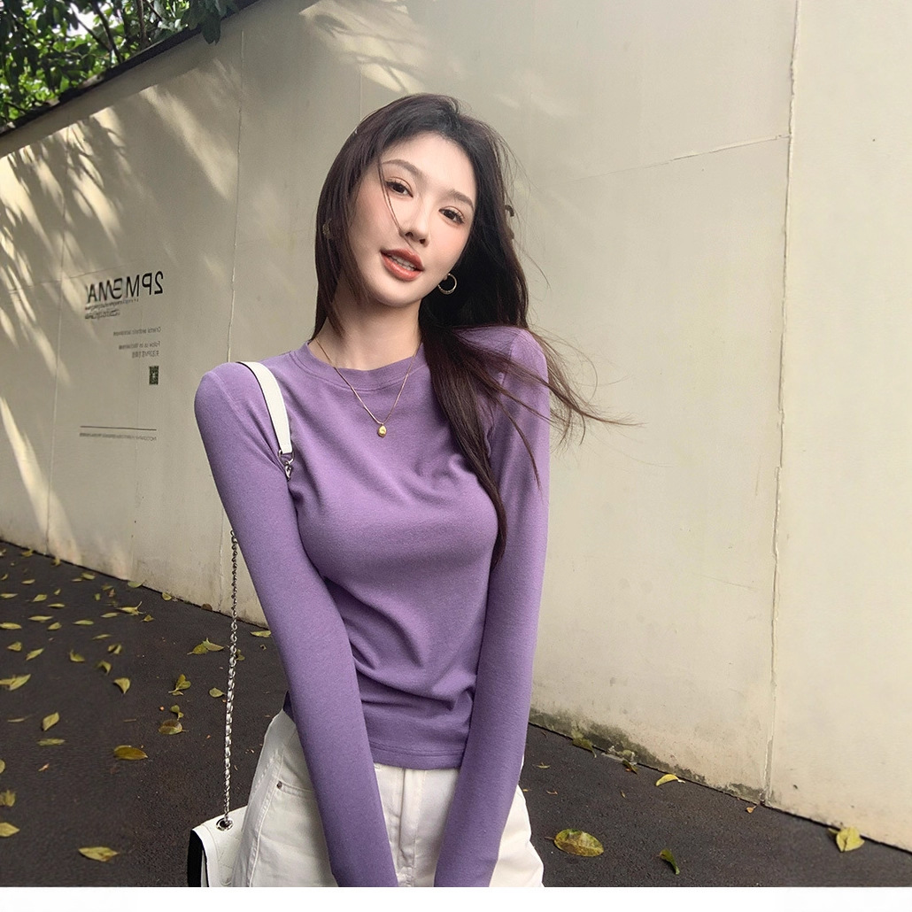 紫色打底衫女长袖2025秋冬新款圆领t恤套头修身显瘦百搭内搭上衣