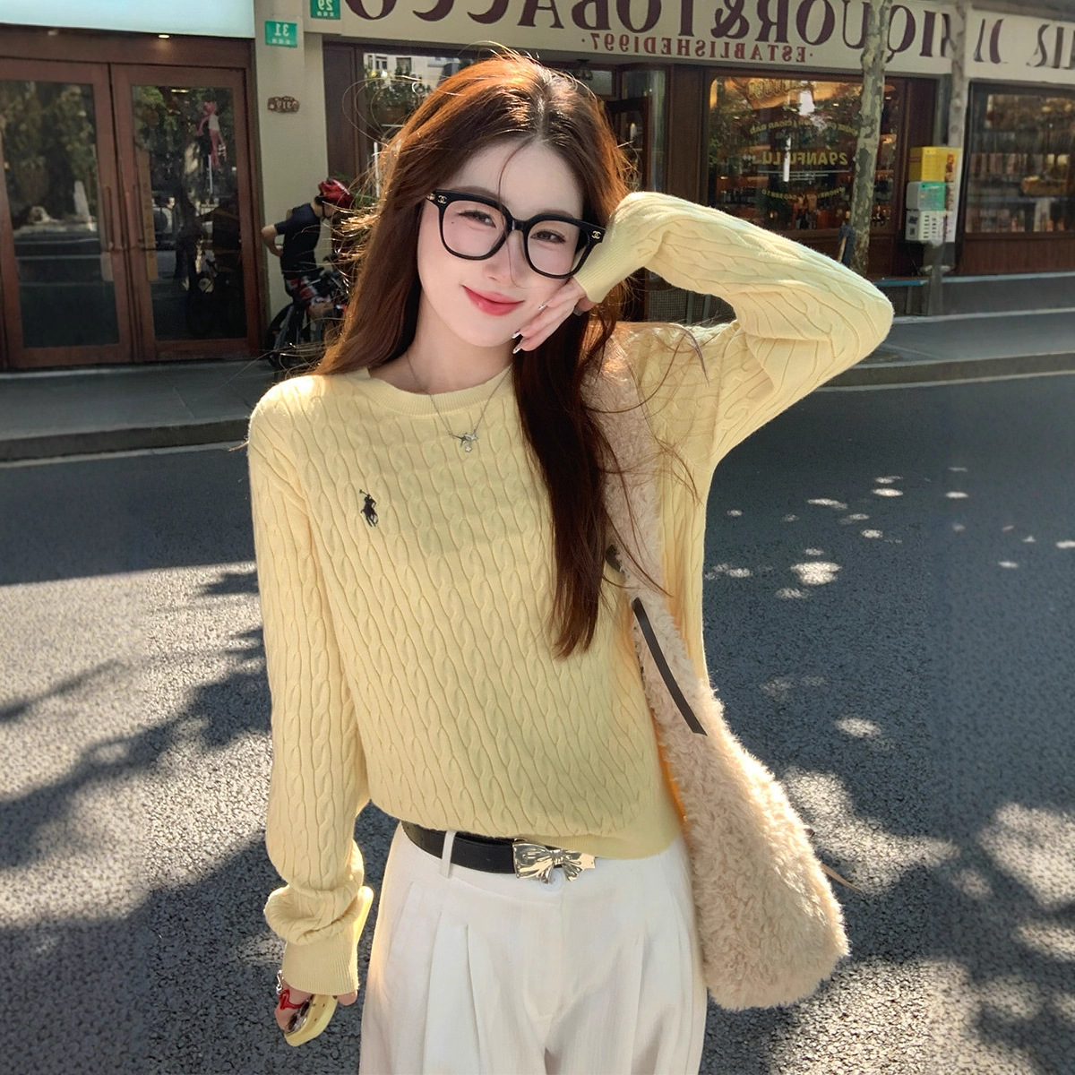 优质小马刺绣奶黄色麻花毛衣女2025新款春秋针织衫外穿高级感上衣