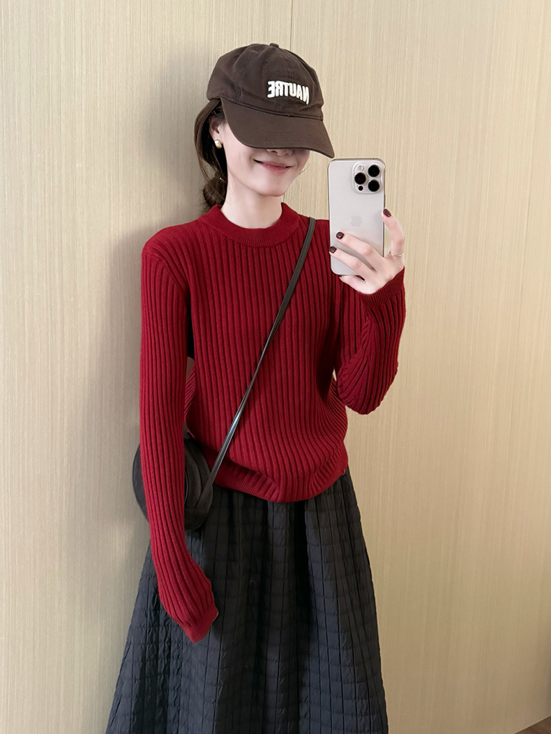 韓国風ラウンドネック無地スリムニットインナーセーター秋冬2026年新作万能長袖セーター女性用