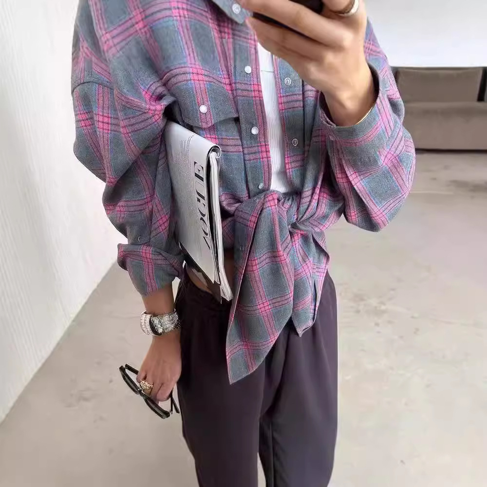 2026复古格子衬衫外套女长袖宽松休闲上衣春秋收腰显瘦磨毛衬衣