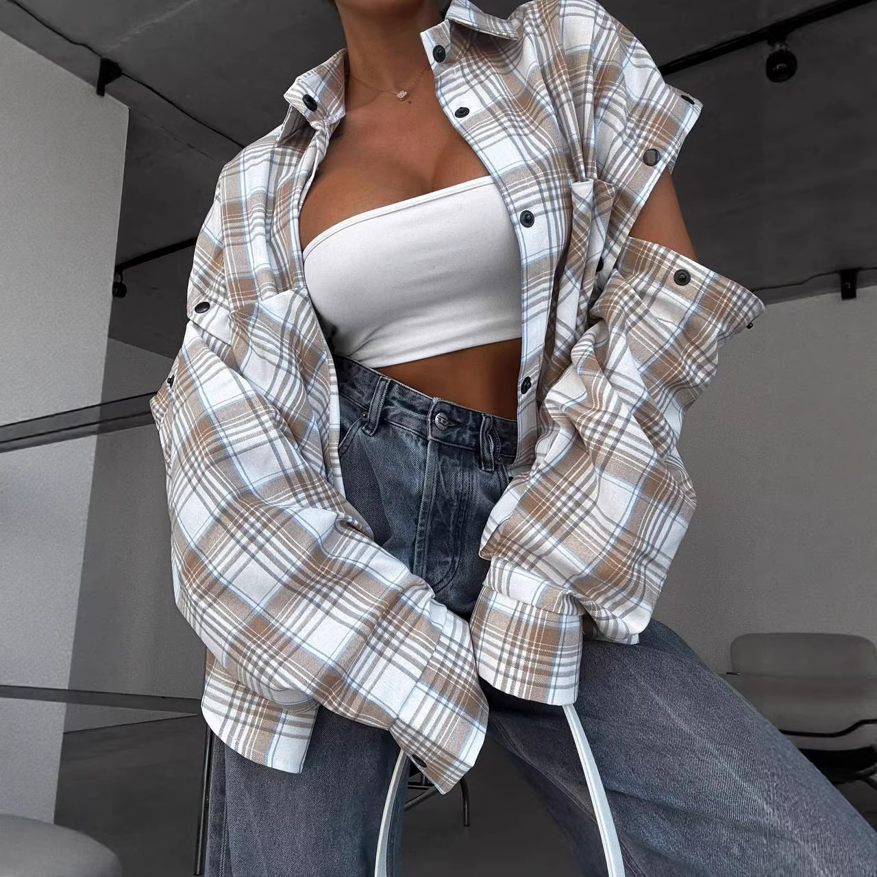 欧美2026亚马逊OZON格子衬衫女复古宽松外搭中长款美式衬衣街头女