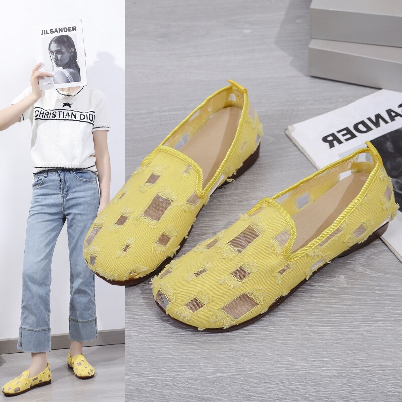 春夏の通気性に合わせて柔らかい底の靴の頭の網の紗の平の底の1足は女性靴の浅い口の夏のサンダルを漕ぎます。
