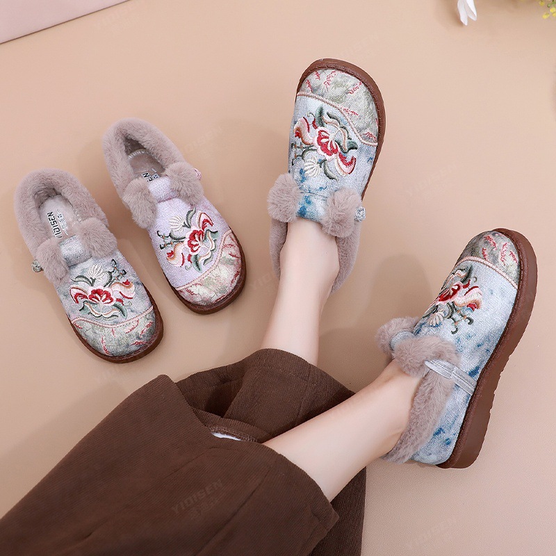 冬季新款加绒加厚保暖中老年妈妈鞋防滑软底一脚蹬中国风刺绣布鞋