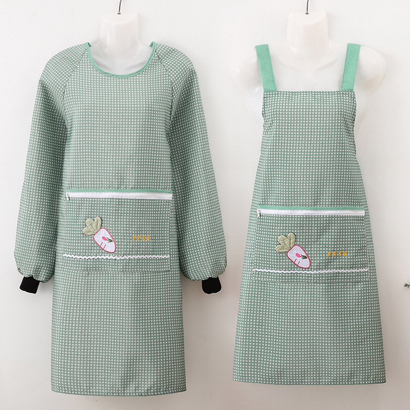 时尚立体刺绣罩衣家居清洁防尘格子围裙厨房做饭防油污长袖反穿衣