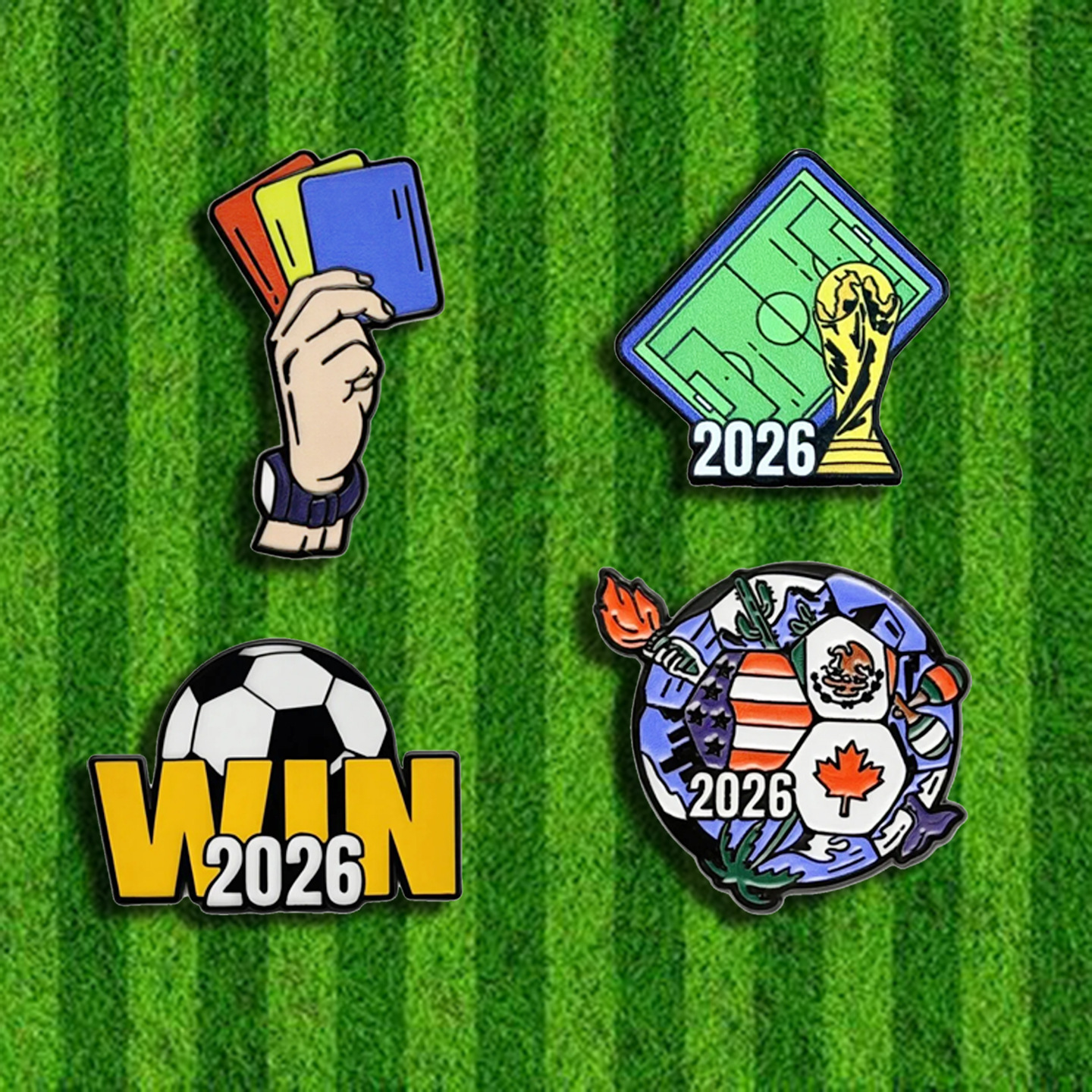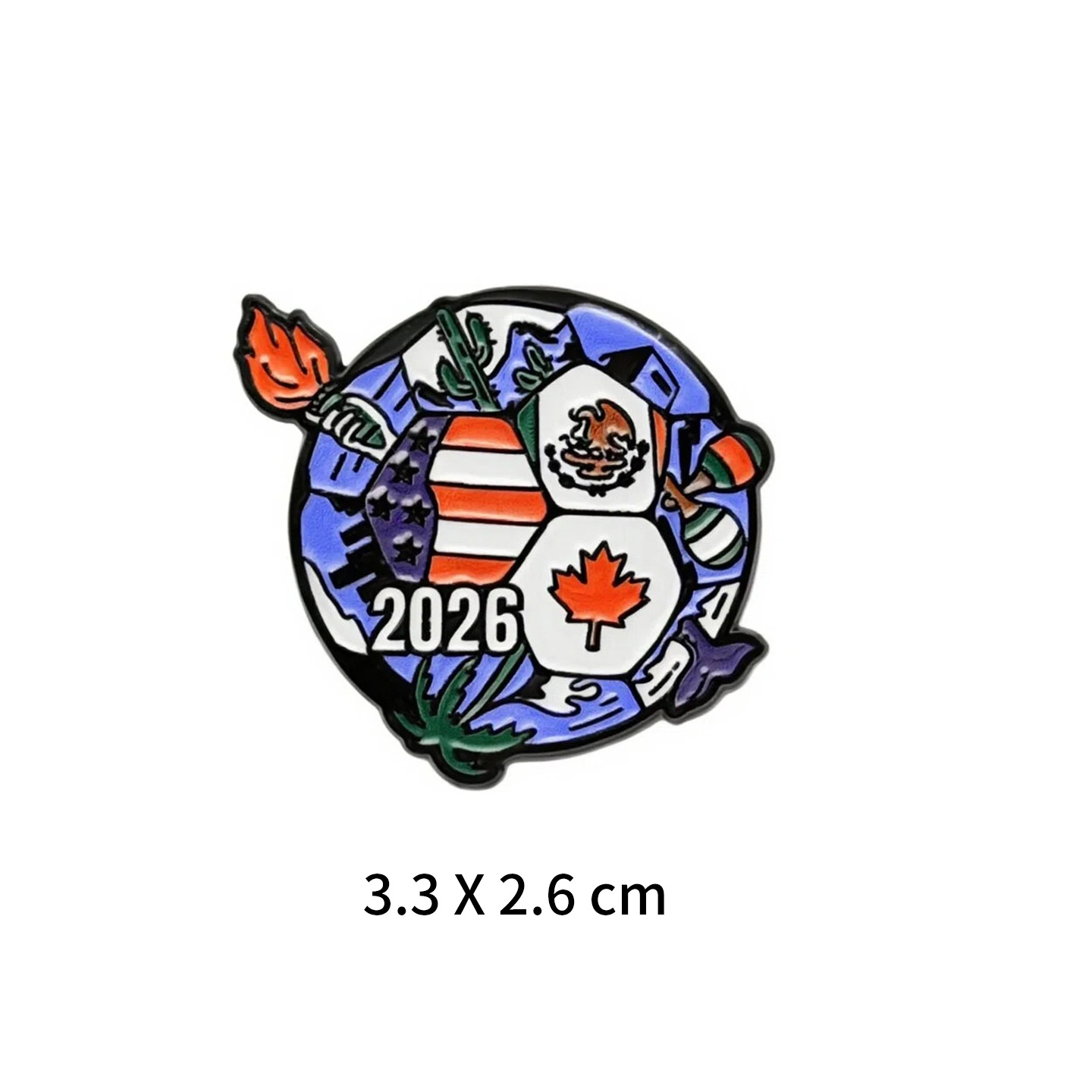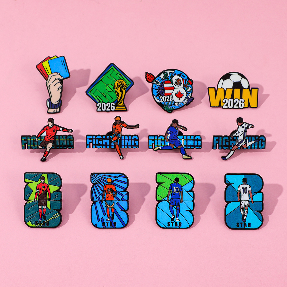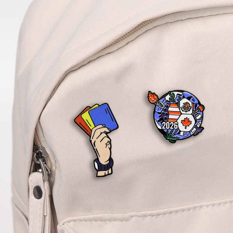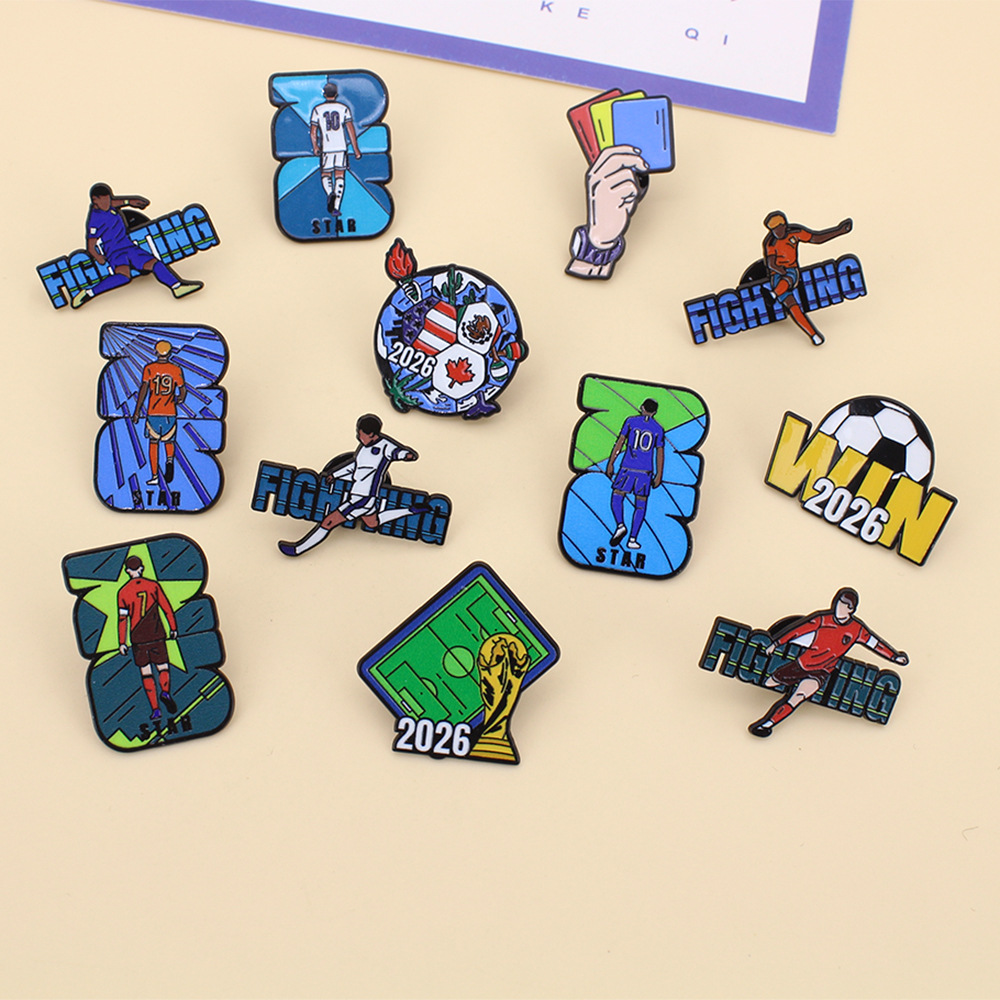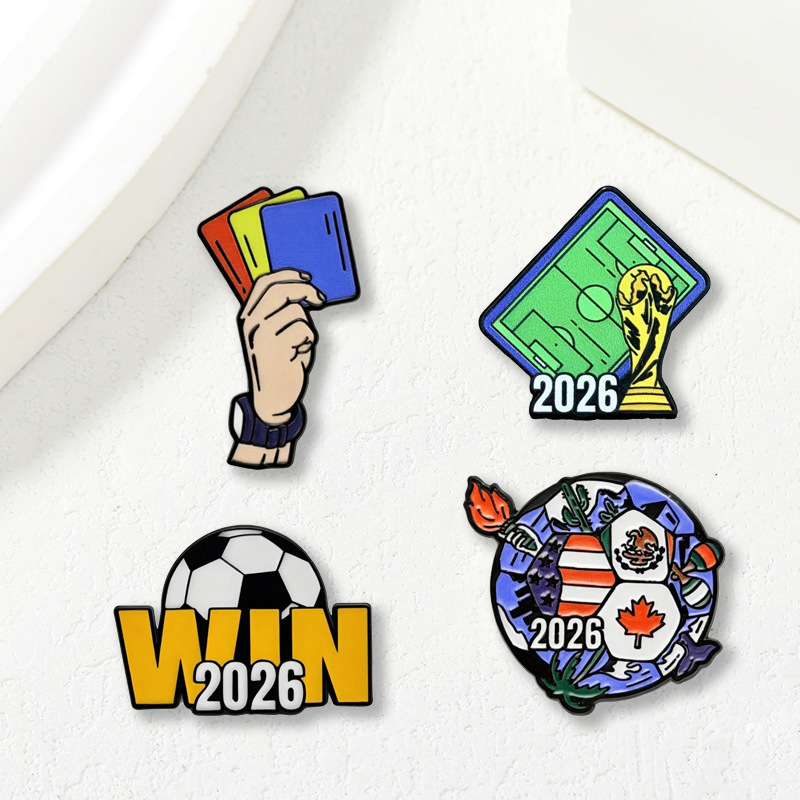 アメリカ、カナダ、メキシコのワールドカップサッカーブローチ、かわいい漫画風合金製、オイル加工、個性的なバックパックアクセサリー、スポーツバッジ