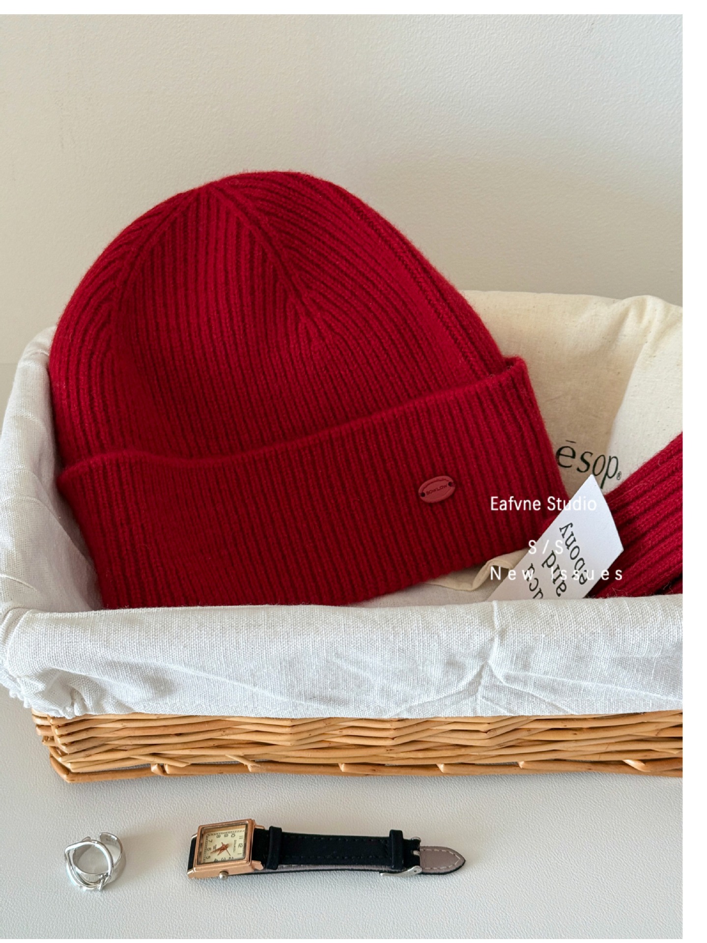高品质新年圣诞红100%纯色羊毛针织帽子加围巾手套3件套女百搭保
