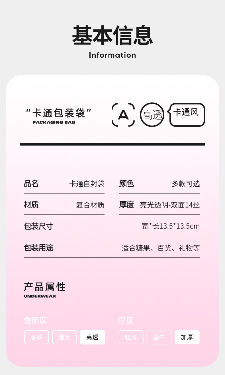 卡通食品自封包装袋三边封头绳皮筋密封袋子加厚塑料袋透明自封口
