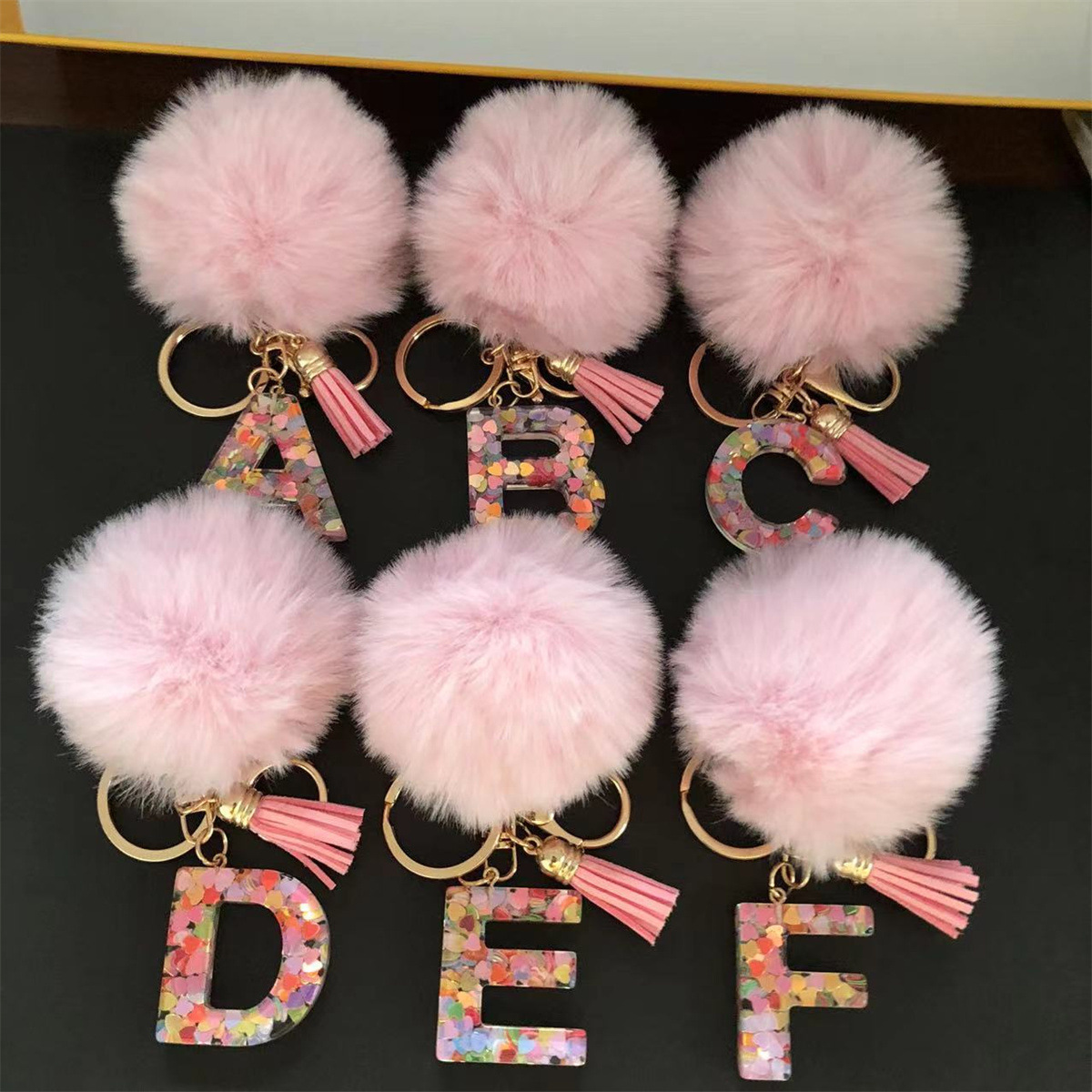 新款欧美流行毛球树脂英文字母包包挂饰钥匙扣流苏字母钥匙链礼物