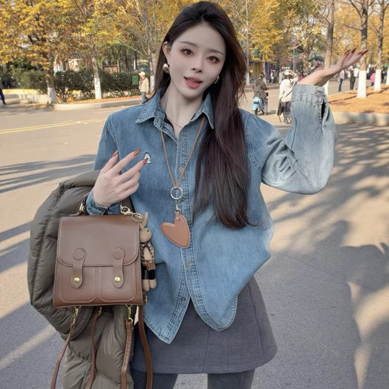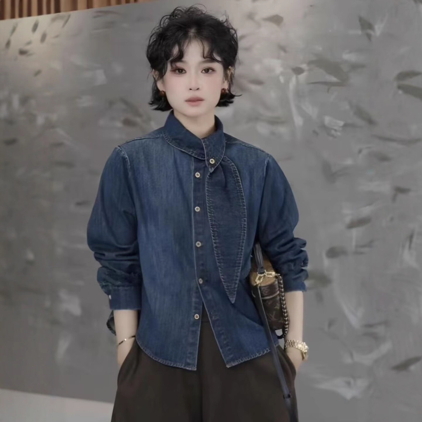 港风复古飘带翻领时尚磨毛牛仔衬衫女秋冬单排扣叠穿内搭打底上衣