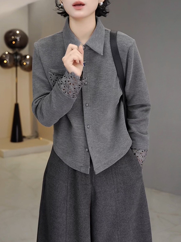 韓国版木耳レース立襟精綿レース刺繍長袖シャツ女性2025春シャツ高品質上着
