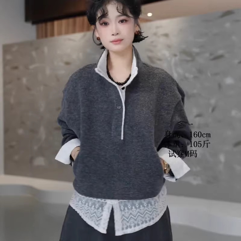 假两件半高领灰色卫衣女蕾丝拼接2025冬百搭长袖上衣纯棉卫衣女款