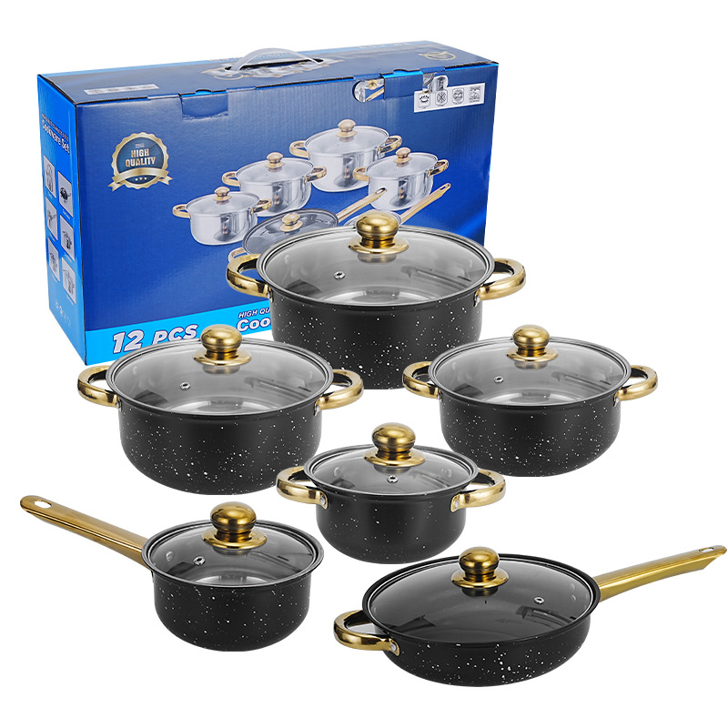 跨境不锈钢麦饭石锅具套装金柄六件套汤锅奶锅煎锅炒锅炊具12pcs