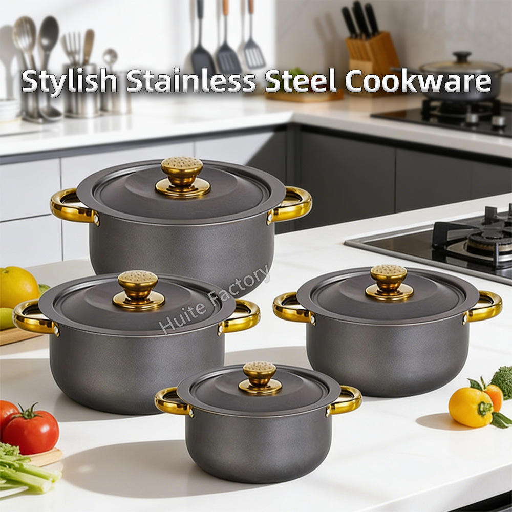 跨境外贸锅具10件套装金色双耳不锈钢汤锅家用厨房电磁炉通用 pot