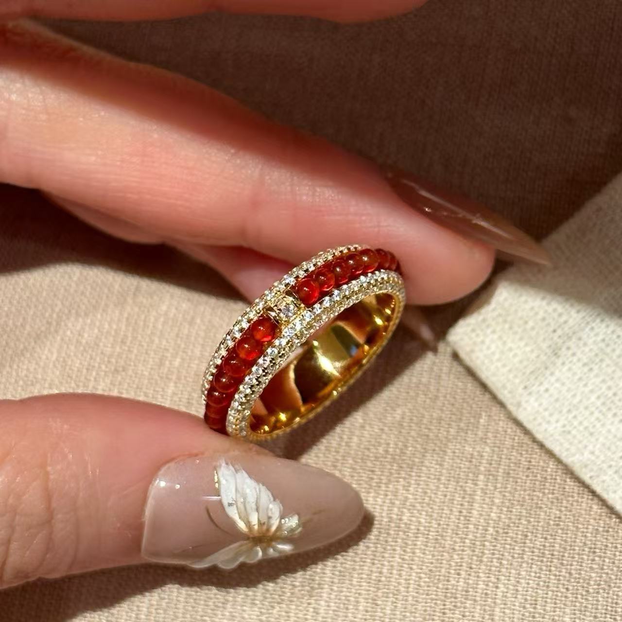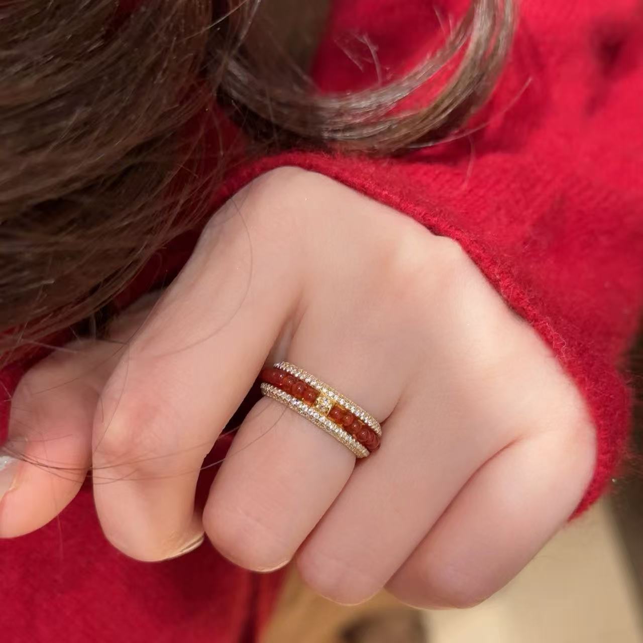 新年“红玛瑙”重工手作编织玛瑙串珠戒指显白复古时尚指环食指戒