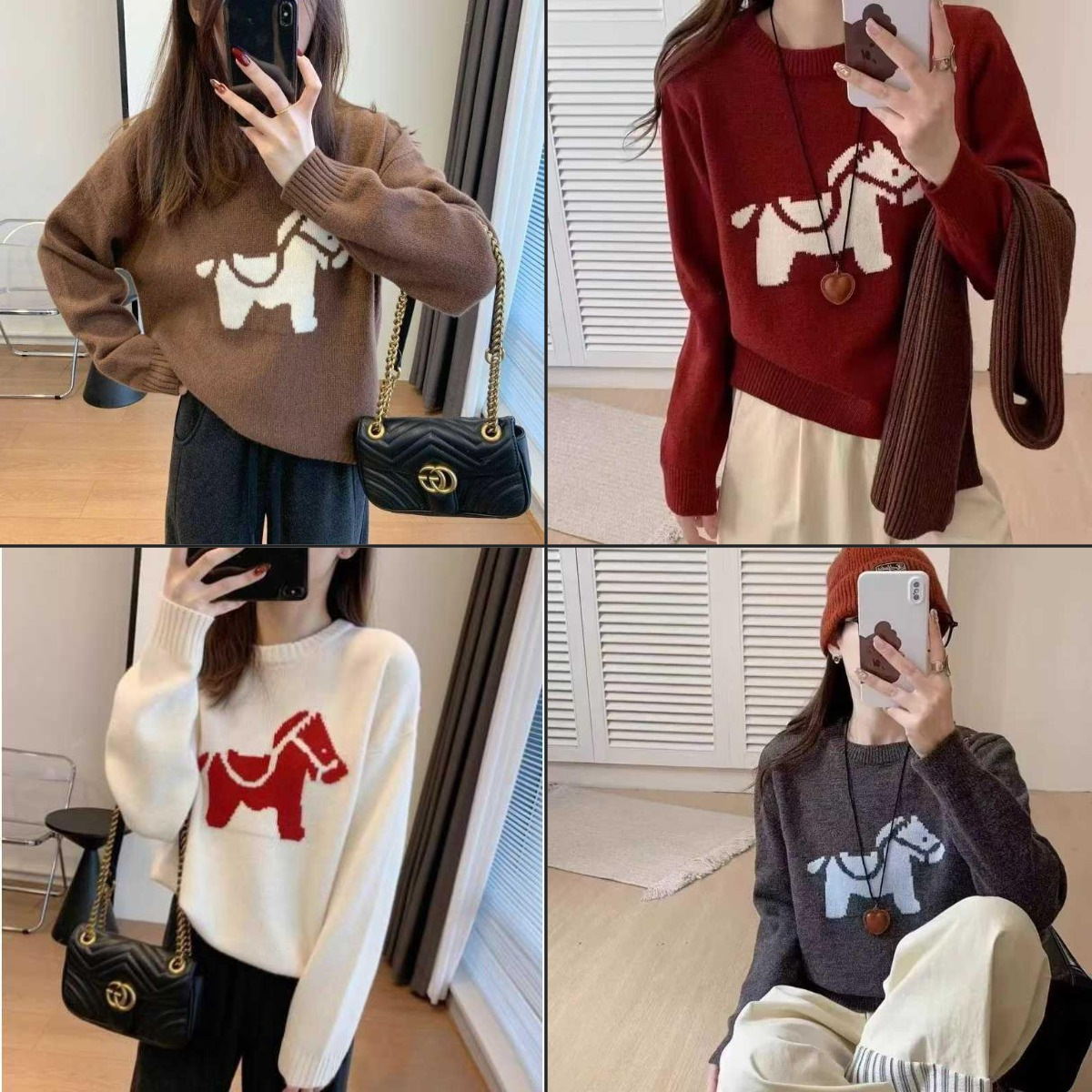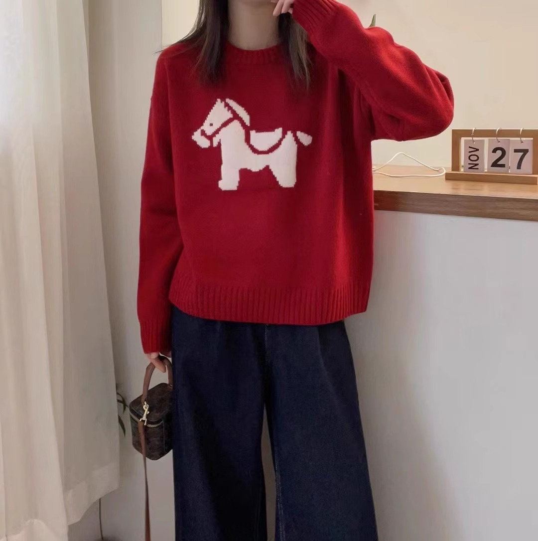 可爱提花小马图案打底针织衫女秋冬新年红色本命年毛衣显瘦上衣春