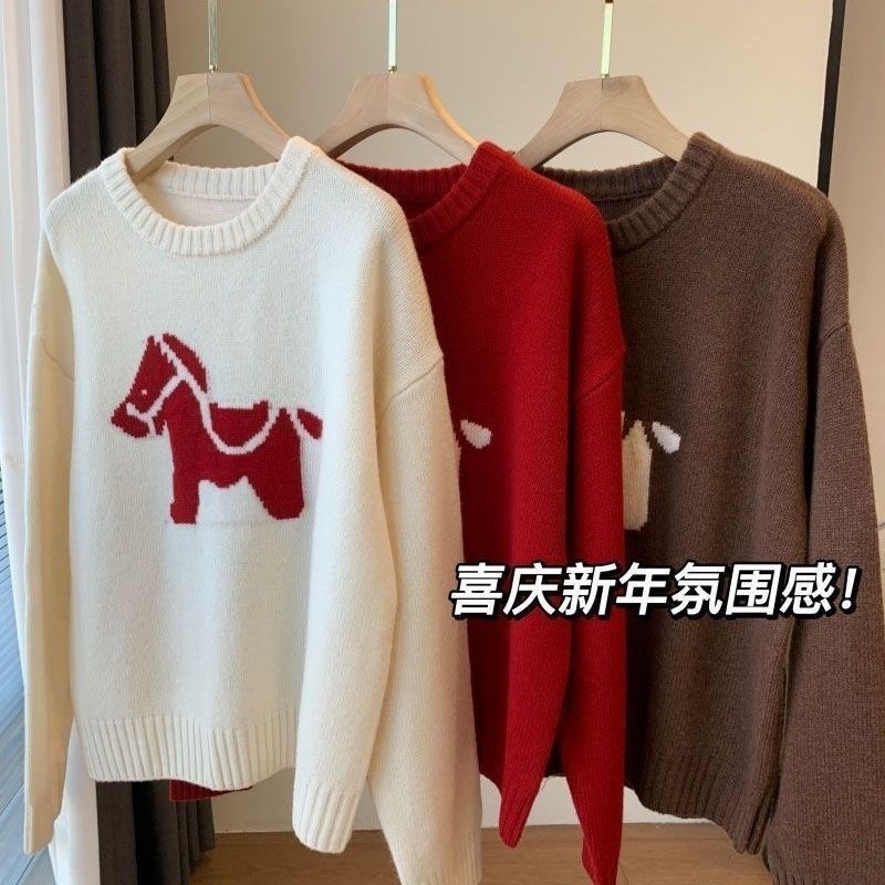 可爱提花小马图案套头针织衫女2025秋冬季新款新年红色圣诞毛衣潮