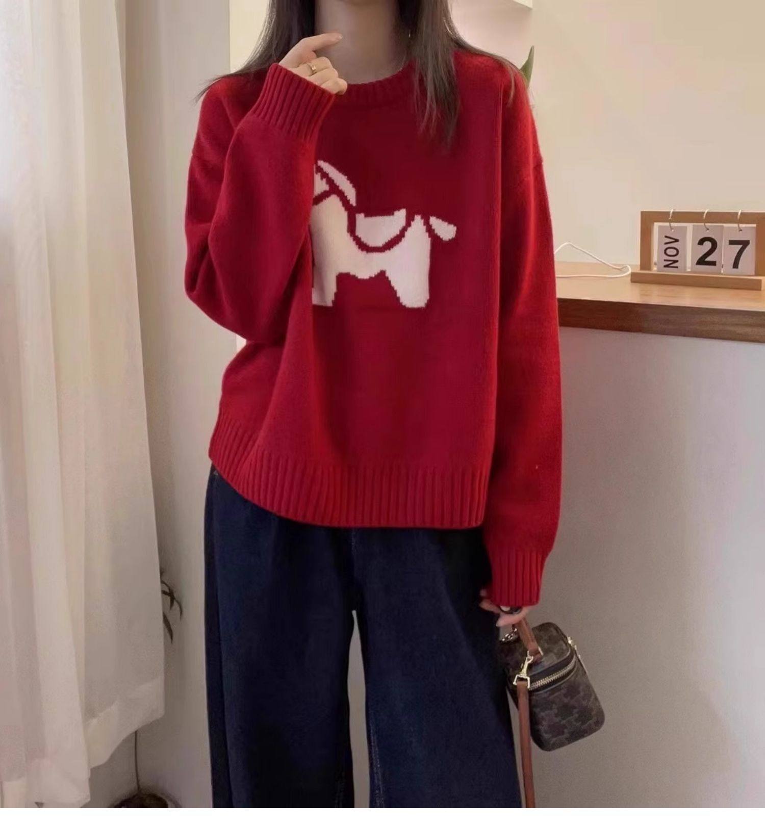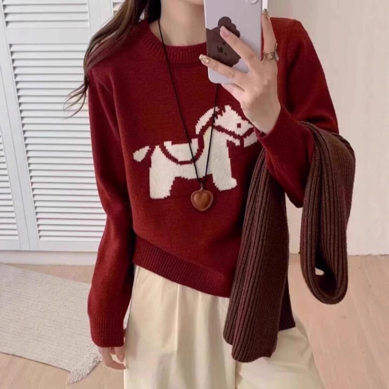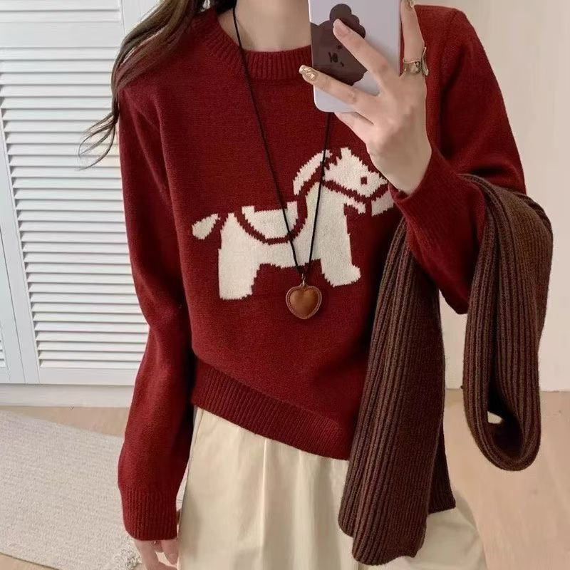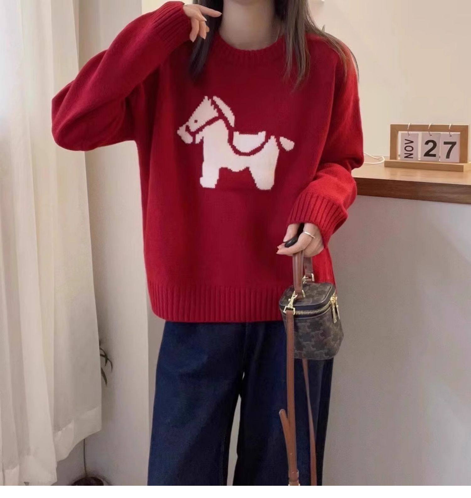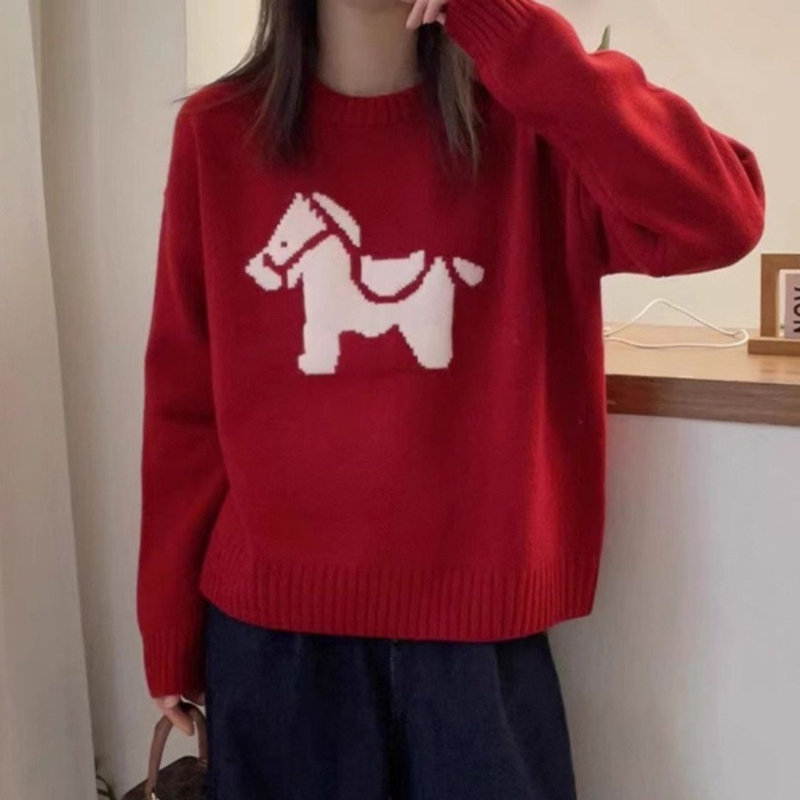 洋气学院风针织衫毛衣秋冬红色新款小马图案提花长袖宽松保暖上衣