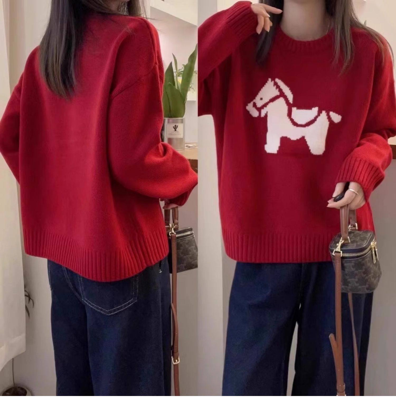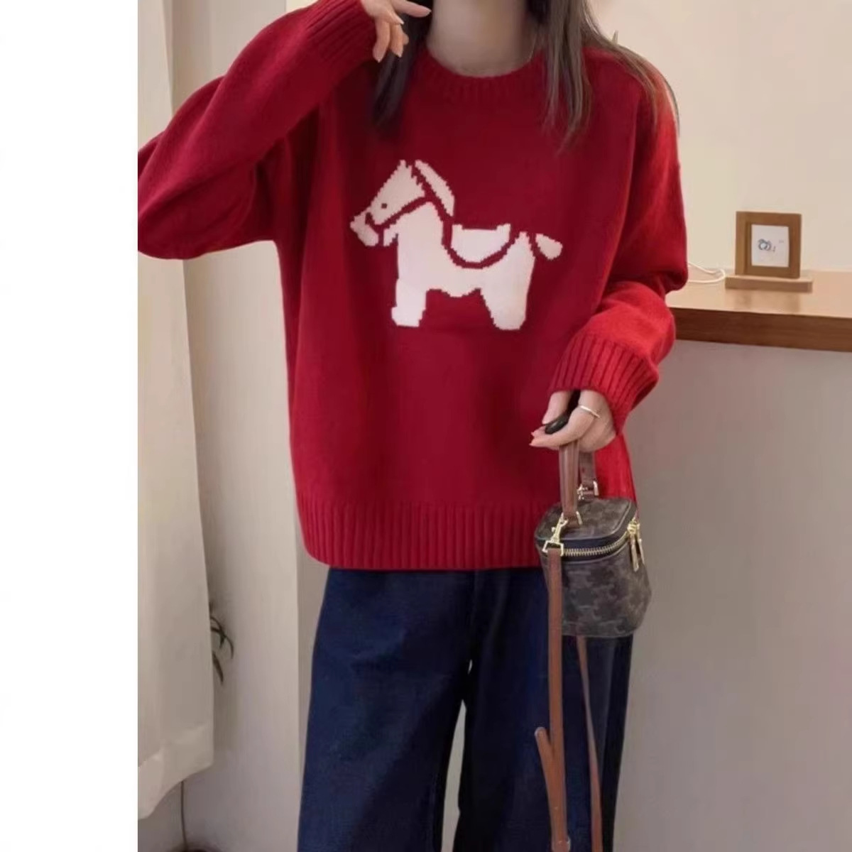 可爱小马提花红色毛衣女圆领秋冬2025新款套头宽松百搭减龄针织衫
