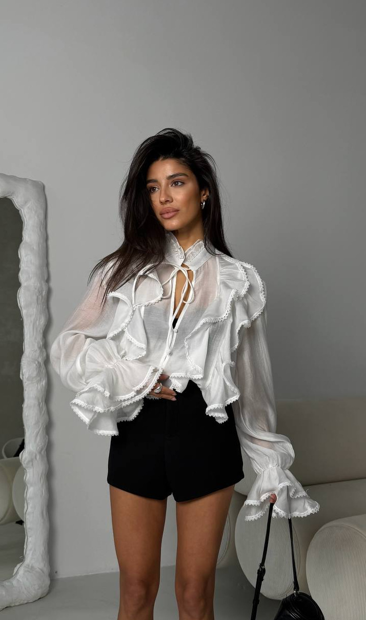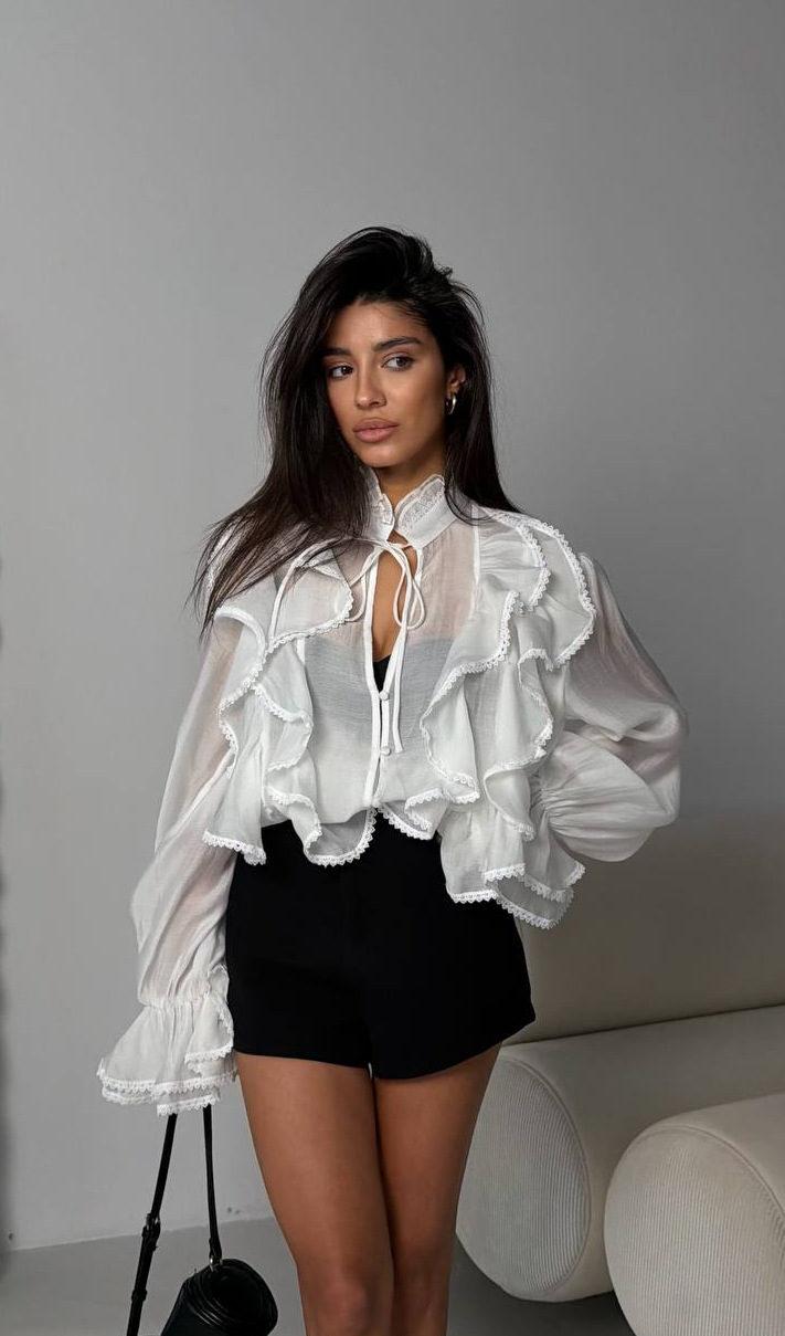 2026白色荷叶边衬衫女士春夏款百搭休闲宽松时尚喇叭袖V领衬衫女