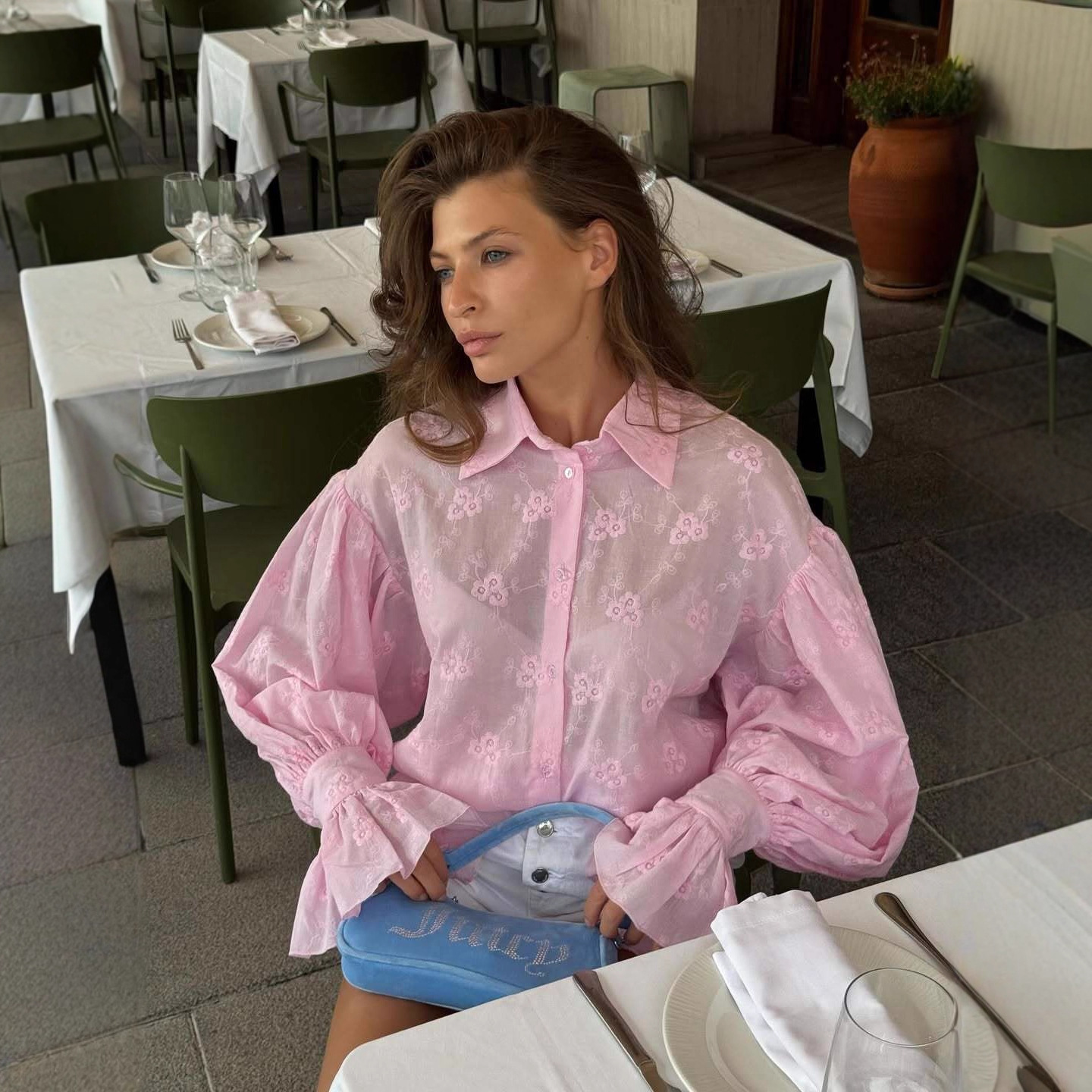 欧美衬衫夏季新款棉感单排扣上衣春秋款宽松衬衫提花粉色外套女秋