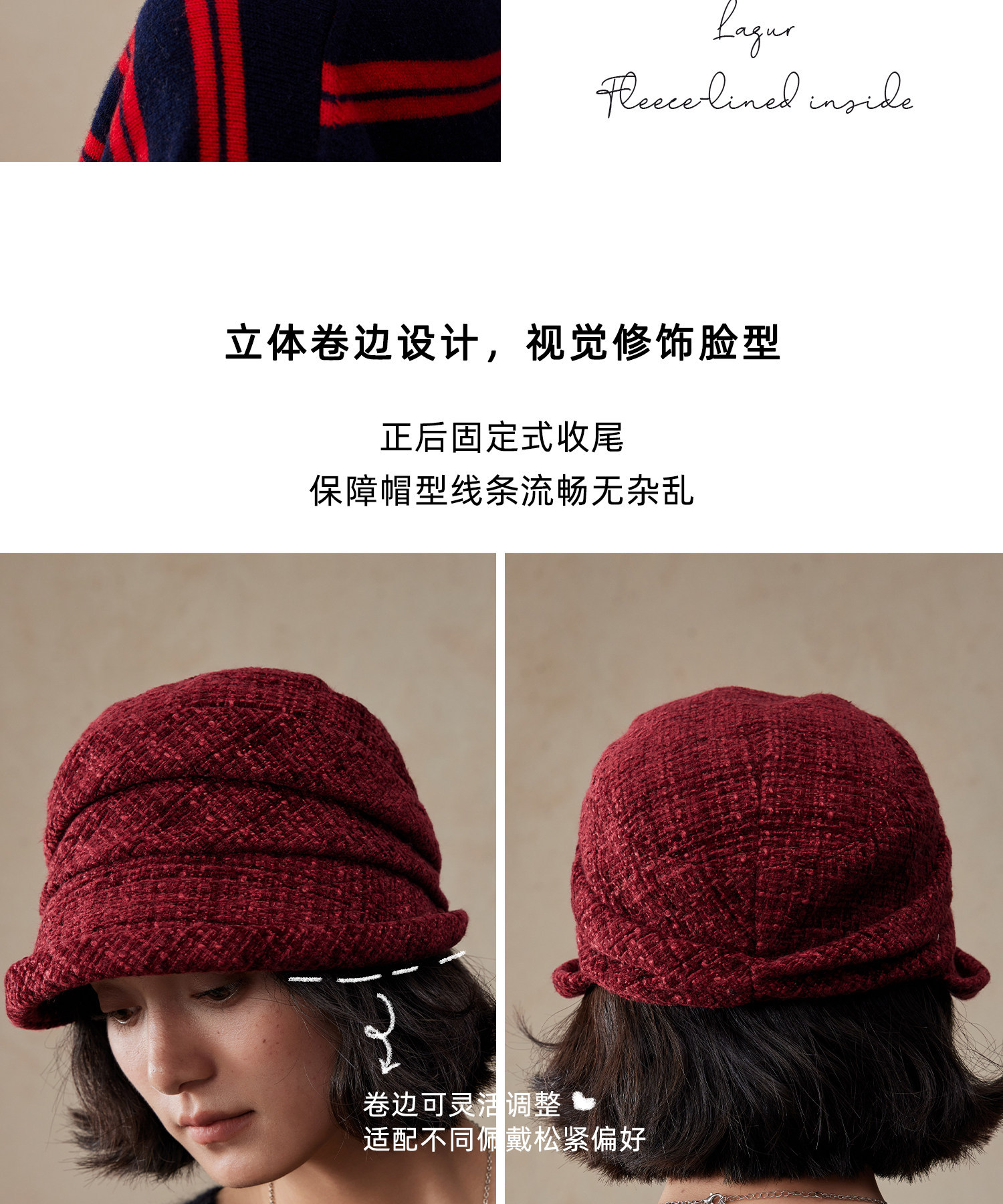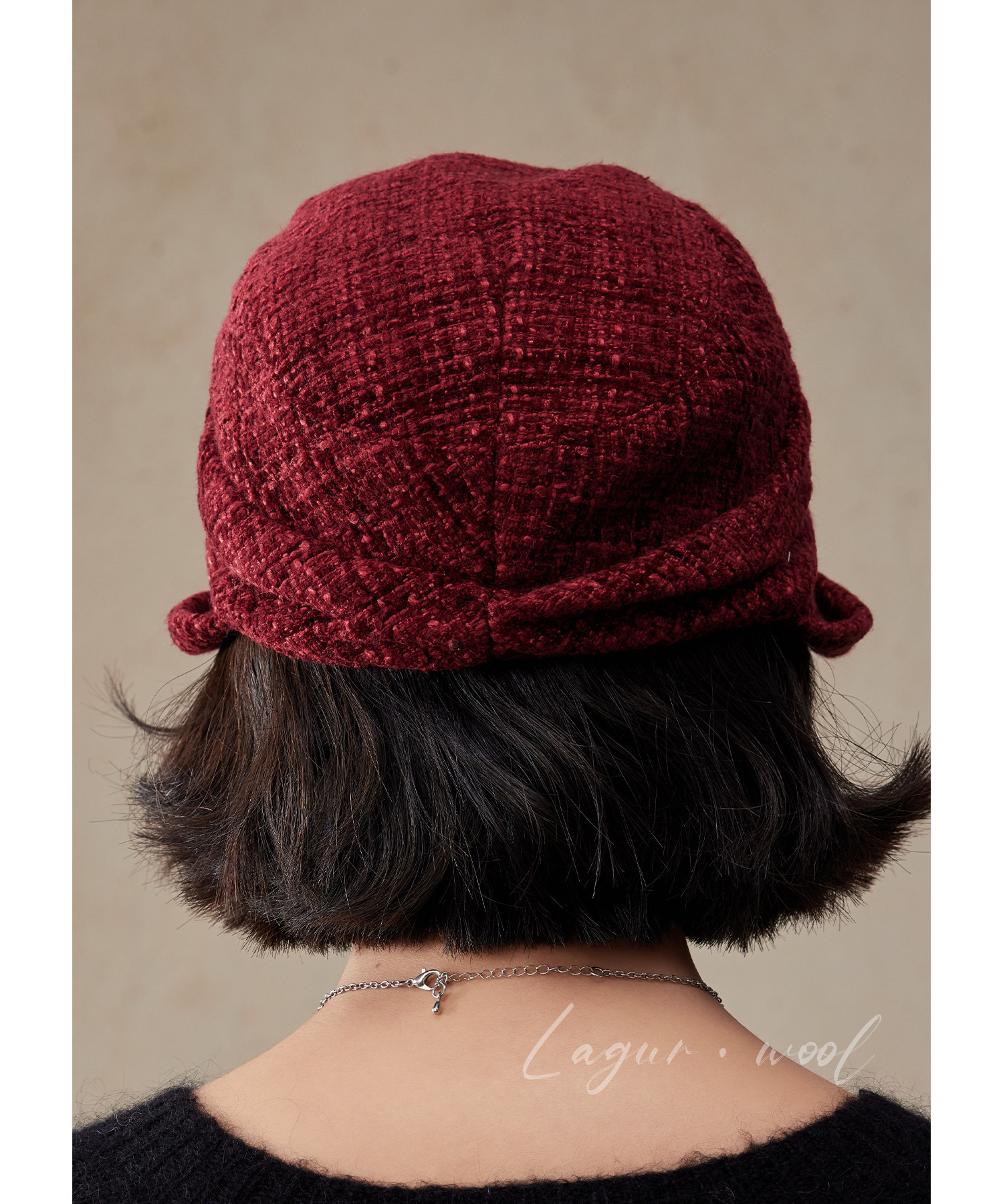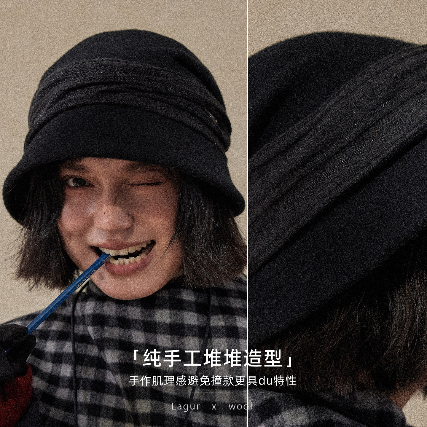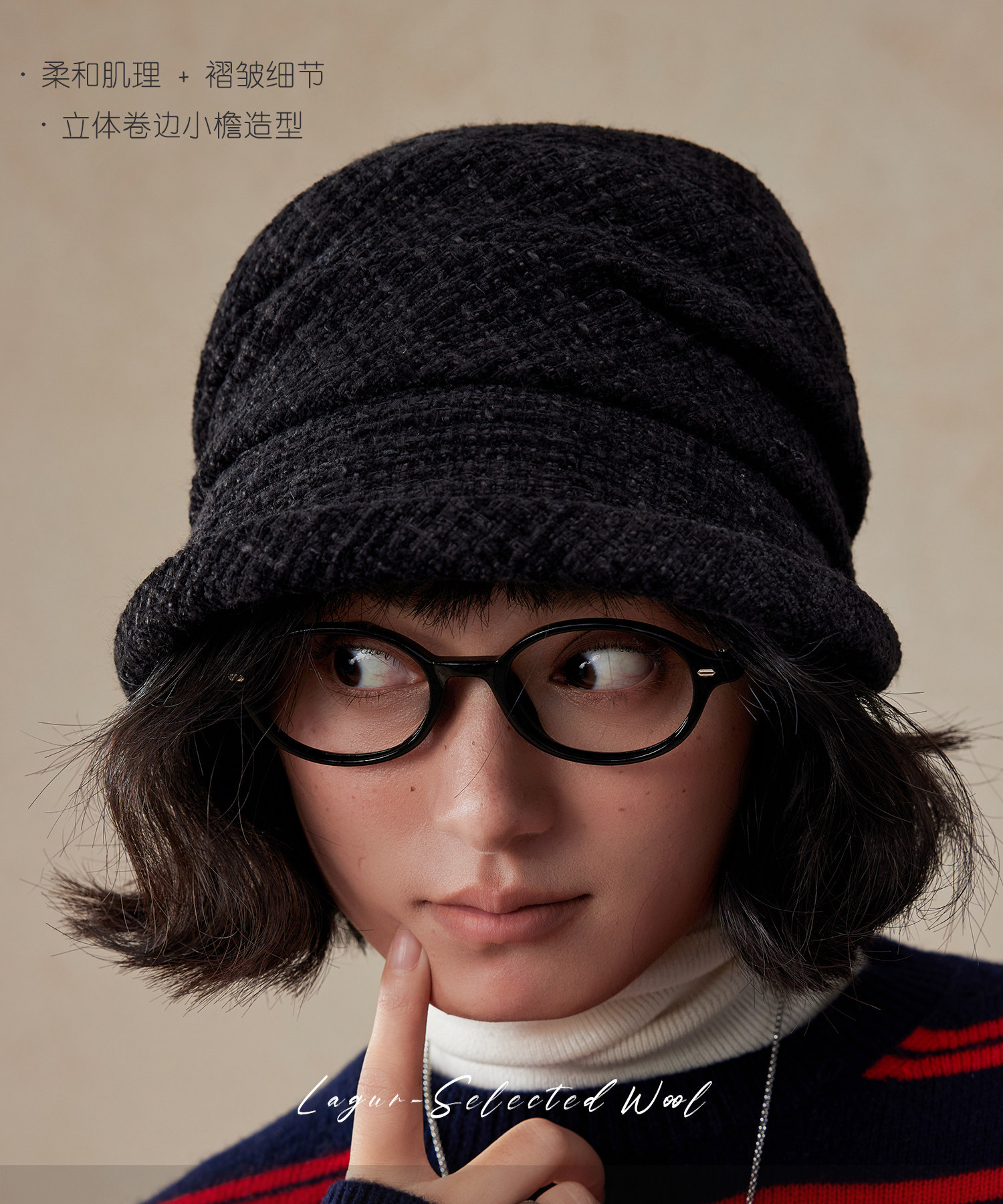 Lagur(经典bi入~)羊毛小檐卷边褶皱优雅渔夫帽加绒香风帽子女冬