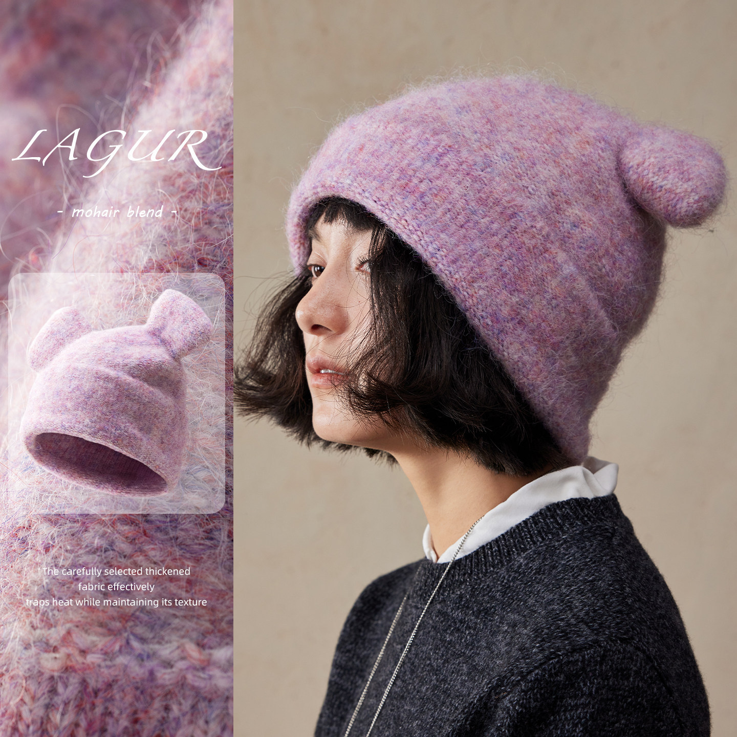 小考拉~慵懒&治愈紫色马海毛可爱减龄耳朵针织毛线帽保暖加厚帽子