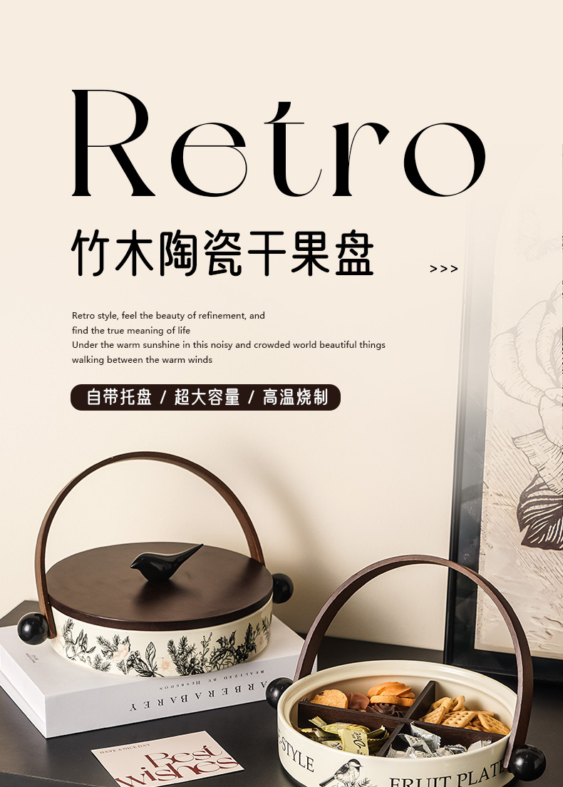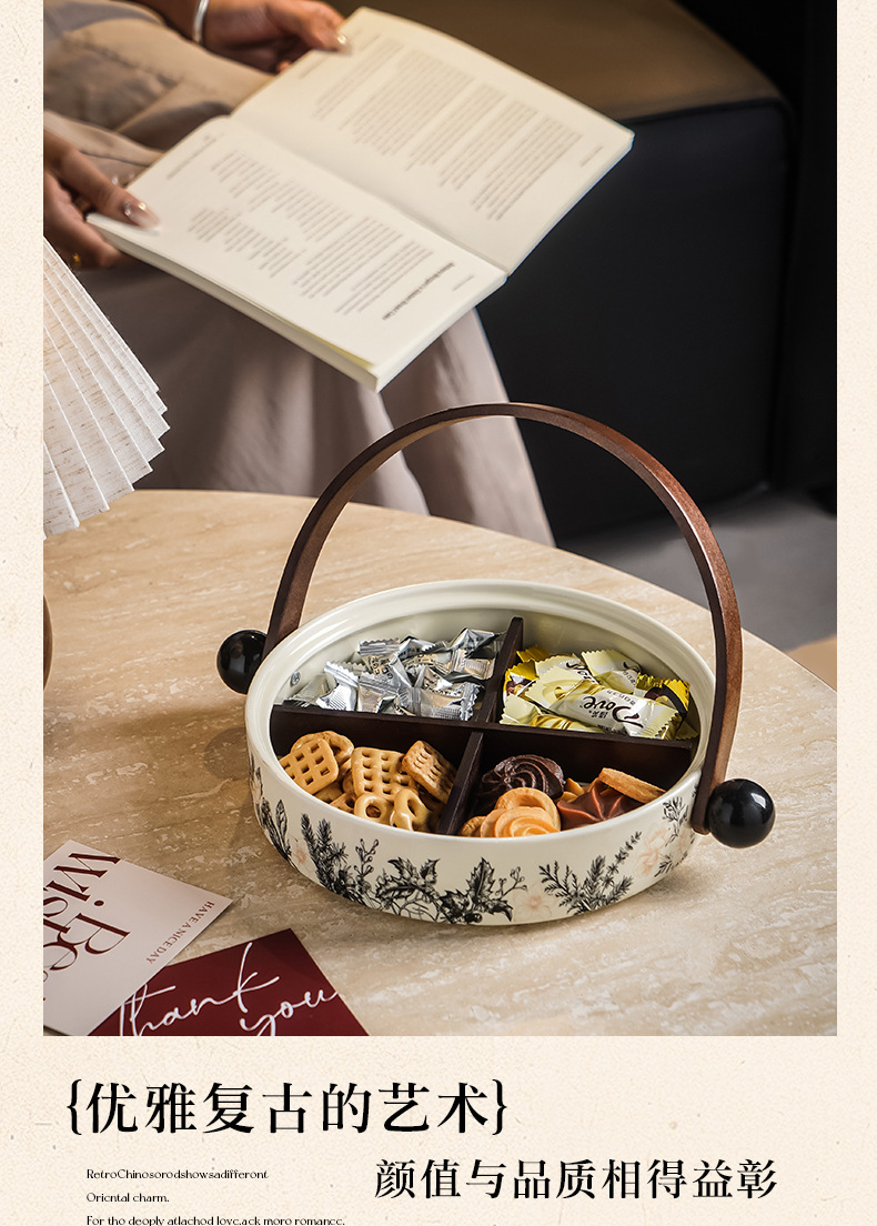 竹木陶瓷干果盘高颜值客厅茶几坚果盘过年零食糖果分格密封摆放盘