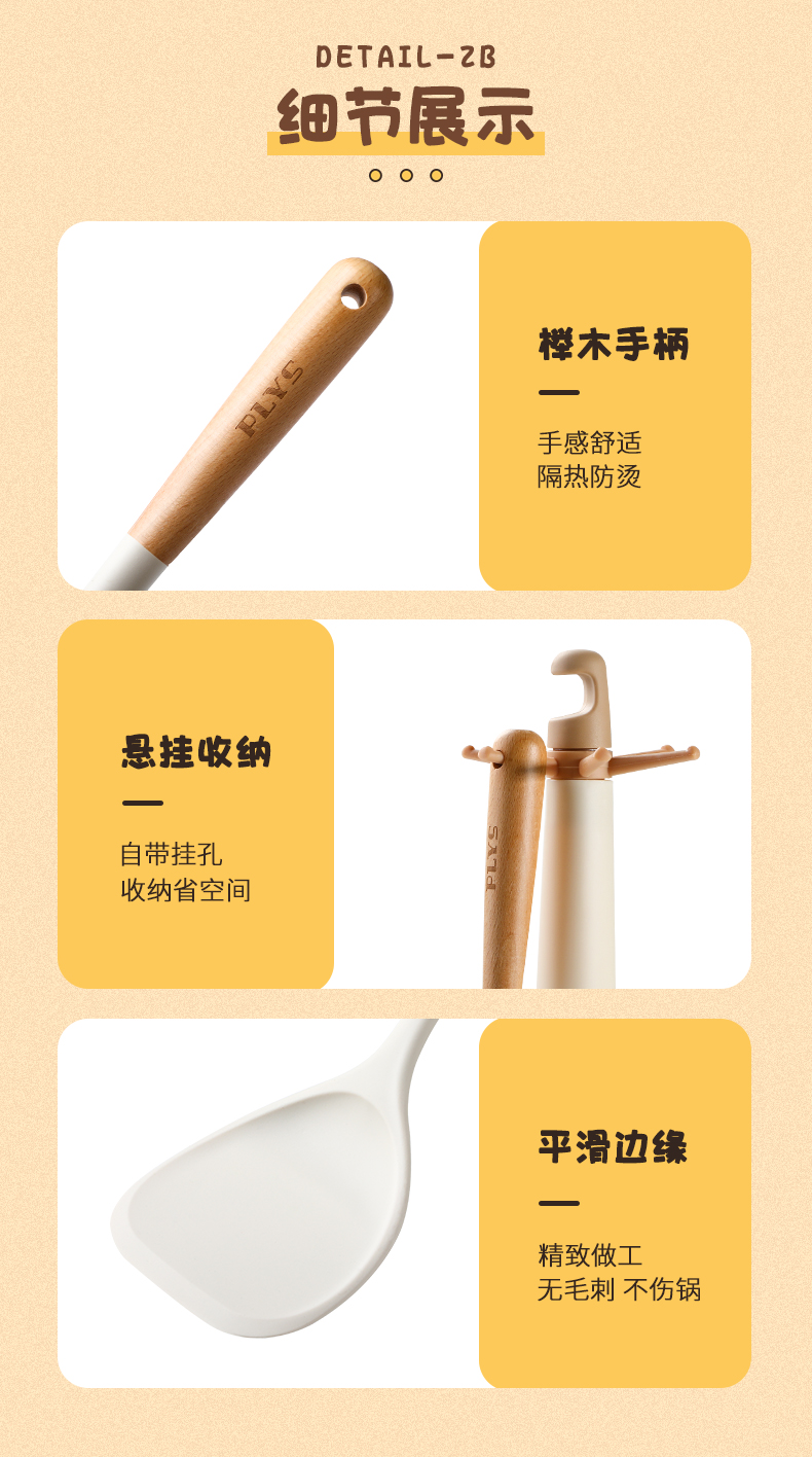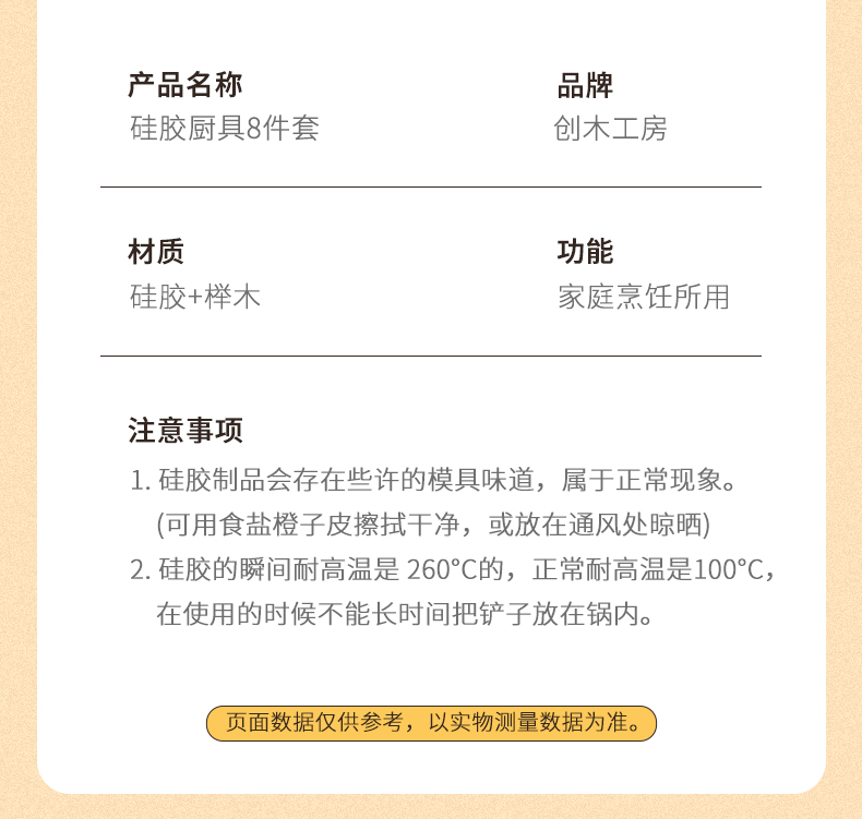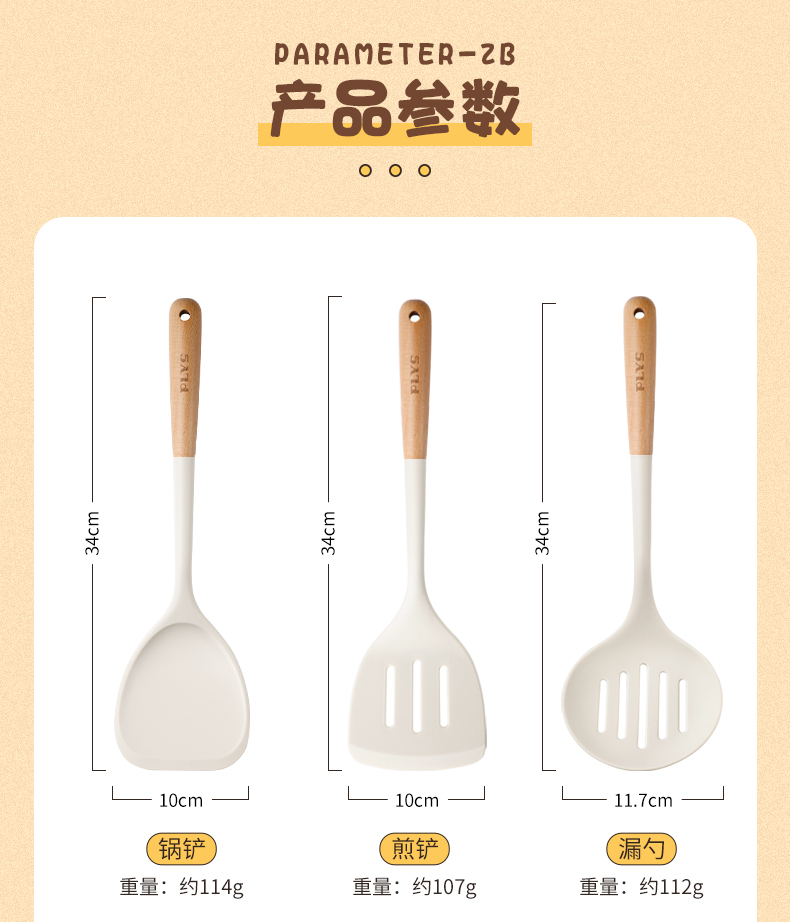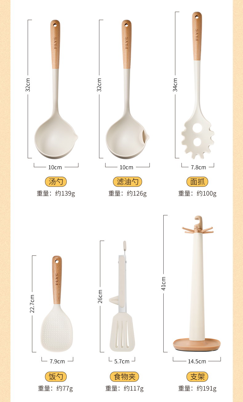 尺寸 食品级硅胶-木柄导流汤勺,食品级硅胶-木柄硅胶漏勺,食品级硅胶-木柄硅胶锅铲,食品级硅胶-木柄硅胶煎铲,食品级硅胶-木柄硅胶面抓,食品级硅胶-烤肉夹,食品级硅胶-4件套( 漏勺+菜铲+煎铲+饭勺),店长推荐-5件组合 (菜铲+煎铲+汤勺+漏勺+支架)