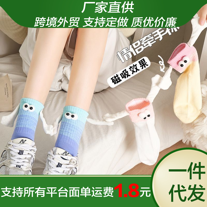 磁吸牵手袜子男女结婚搞怪网红手拉手中筒棉袜女袜跨境亚马逊爆款