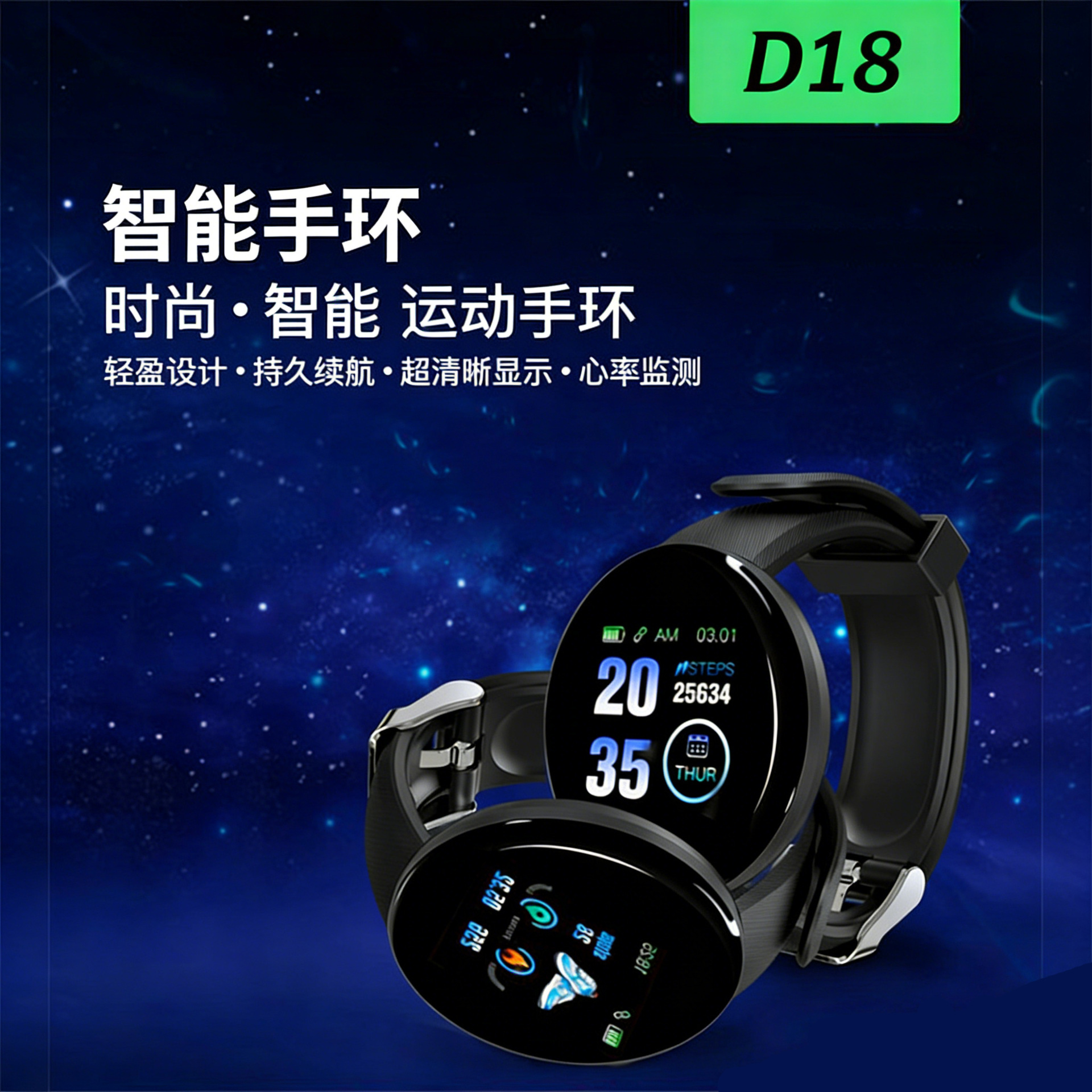 D18智能彩屏手表运动计步信息提醒睡眠监测心率健康血氧检测闹钟