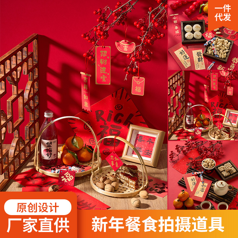 新年の赤い背景板の写真撮影の道具の小さい置物の正月の美食の製品の撮影の中国風は装飾を撮影します。