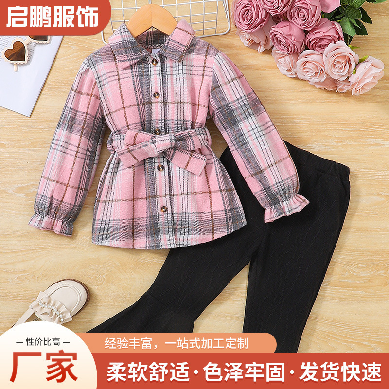 衬衫长袖格子衬衣儿童复古拼色带腰带新款翻领上衣长裤套装女童