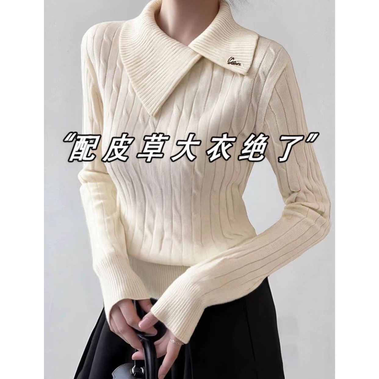 杏色不规则翻领麻花针织打底衫女秋冬毛衣内搭法式高级感短款上衣