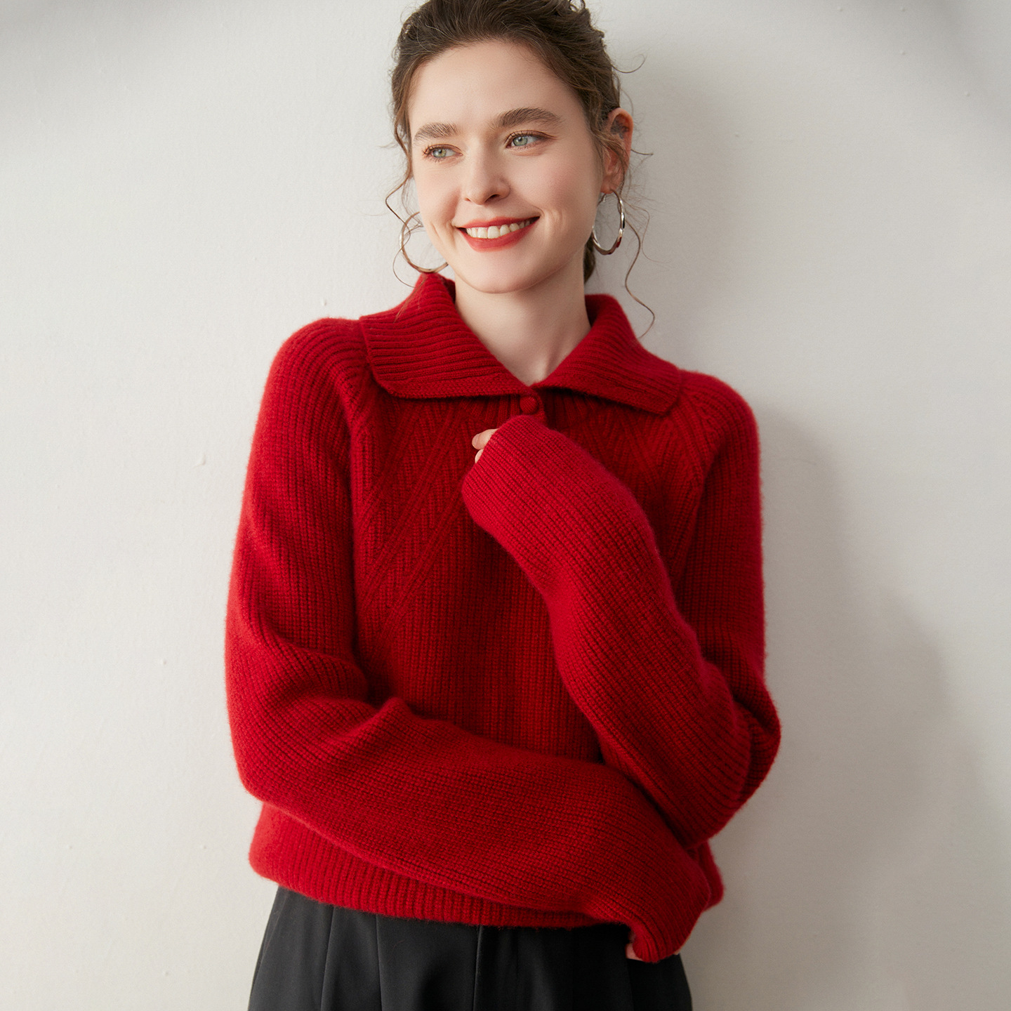 红色100%纯山羊绒衫女欧货翻领秋冬针织加厚新年本命年圣诞红毛衣