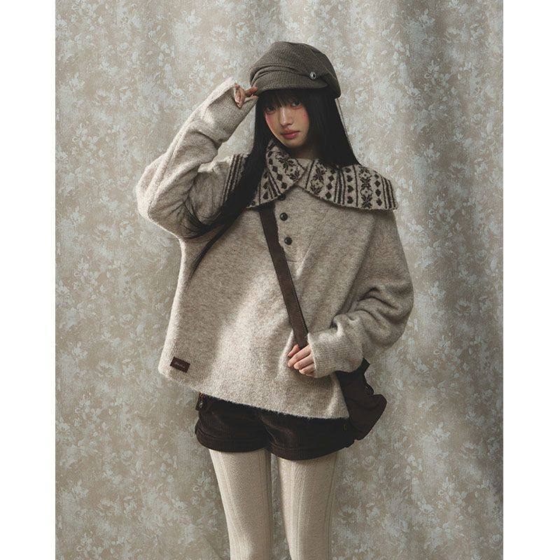 复古大翻领费尔岛宽松提花套头针织毛衣女冬季高级感百搭长袖上衣