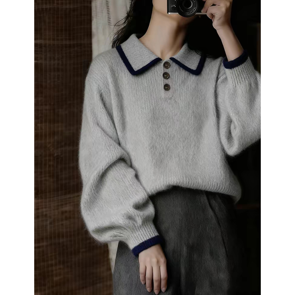 复古灰色翻领纽扣泡泡袖套头毛衣慵懒高级感软糯宽松针织衫2025冬
