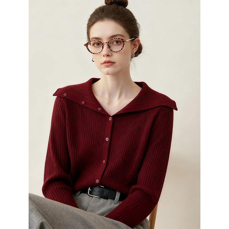 酒红色打底翻领毛衣25年秋冬巨好看针织衫超火减龄薄款修身上衣女