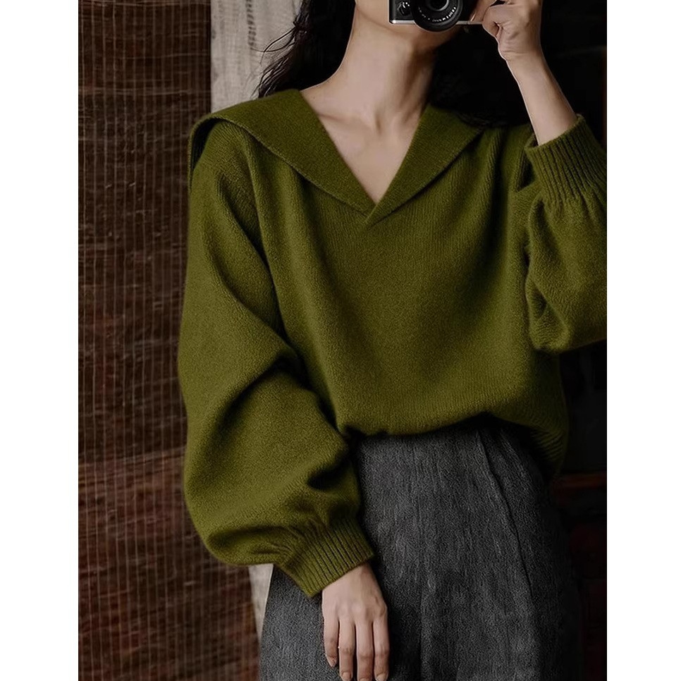 高级感复古v领针织衫女秋冬老钱风内搭毛衣慵懒风海军领上衣