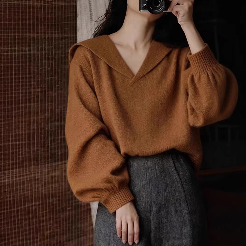 高级感复古简约v领针织衫女秋冬老钱风内搭毛衣慵懒风海军领上衣