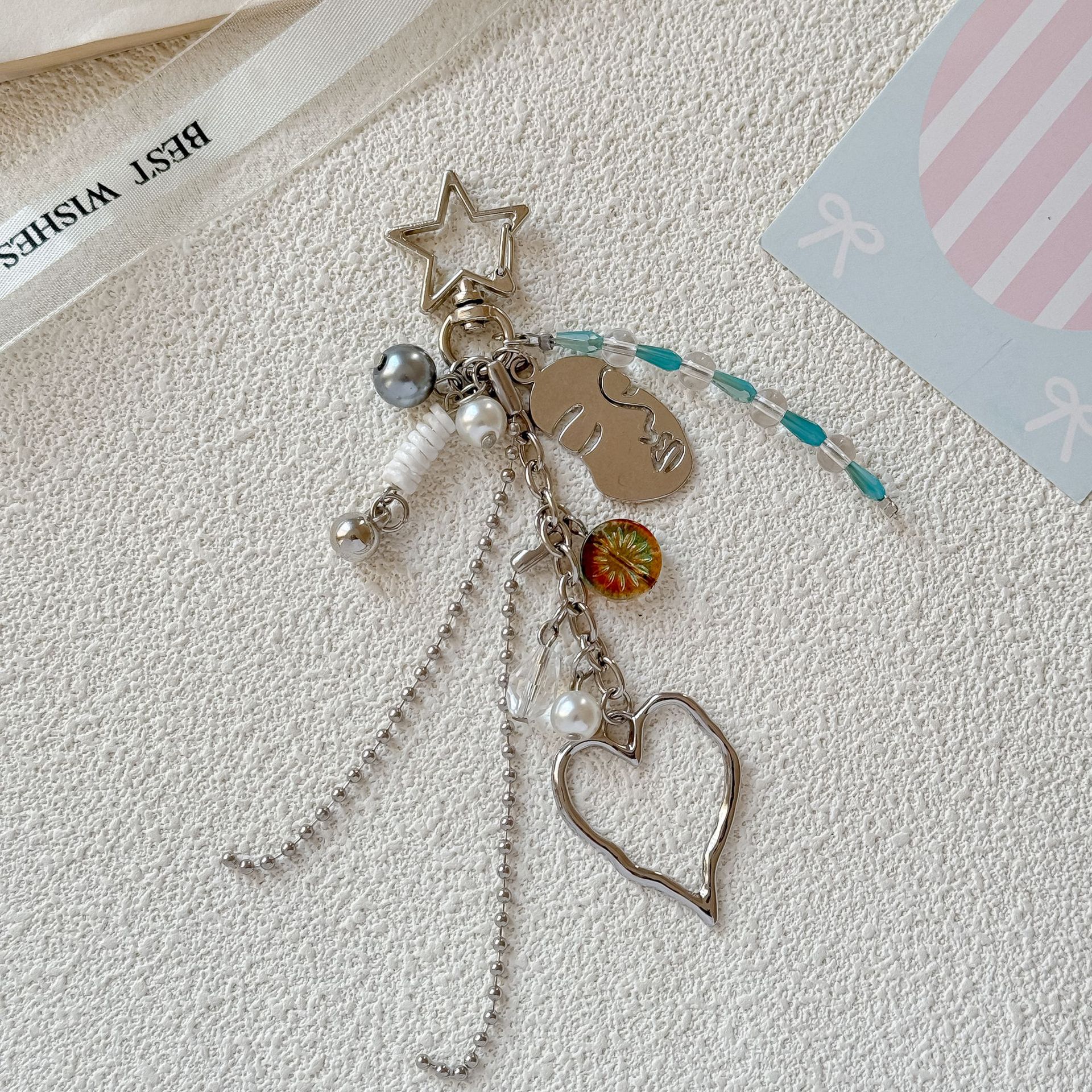 跨境抽象人脸个性包挂银色爱心吊坠钥匙扣串珠时尚服装配饰批发