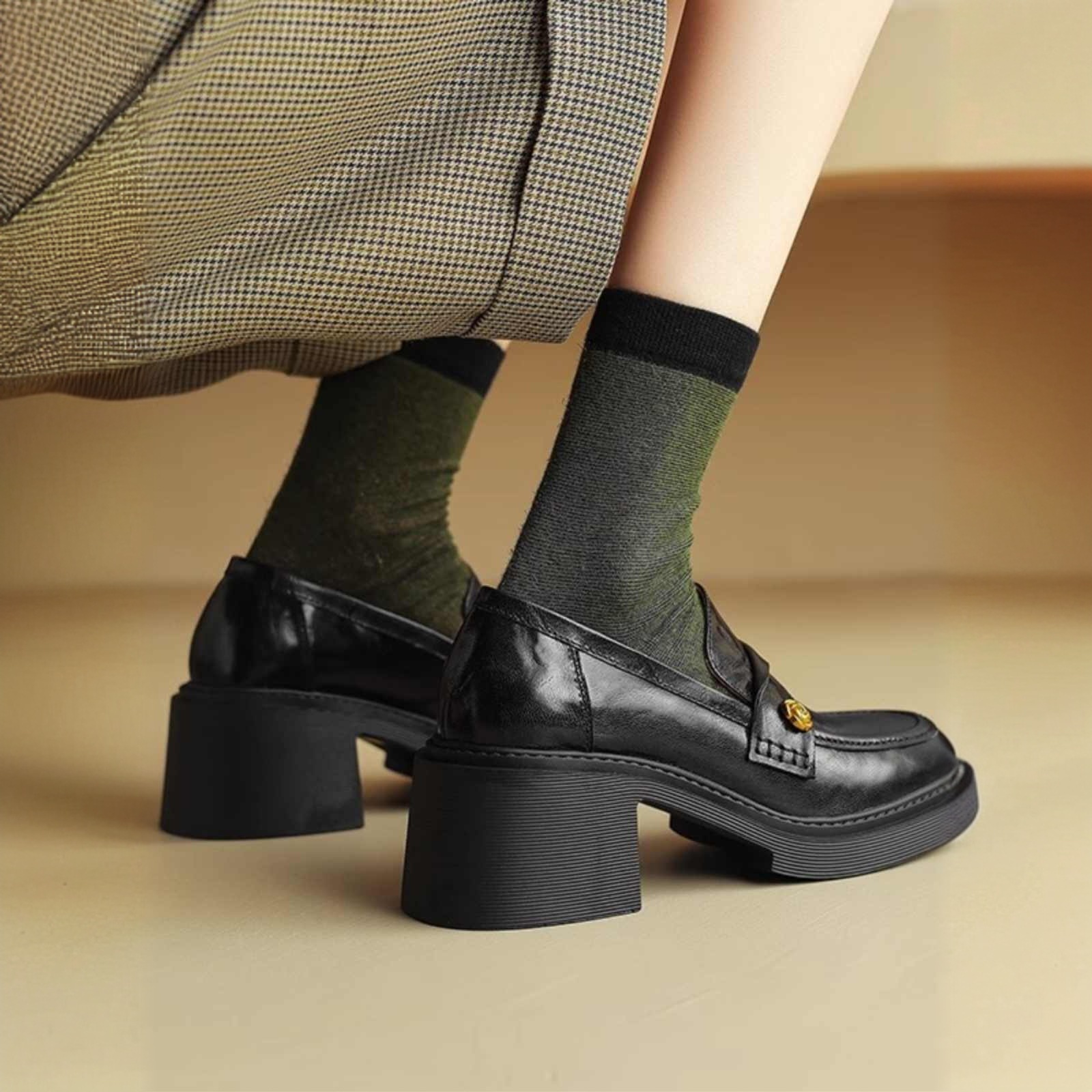 【在庫あり】2915 ソフトレザー ブラック レトロ 太ヒール ローファー レディース 2025春秋新作 フレンチ風 厚底