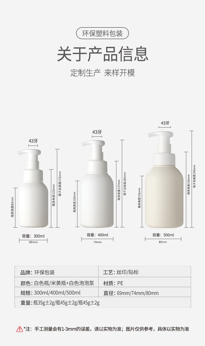 规格型号 500ml;(特价)米黄瓶+白色泡沫泵;HDPE,500ml;白色瓶+白色泡沫泵;HDPE,400ml;(特价)米黄瓶+白色泡沫泵;HDPE,400ml;白色瓶+白色泡沫泵;HDPE,300ml;(特价)米黄瓶+白色泡沫泵;HDPE,300ml;白色瓶+白色泡沫泵;HDPE