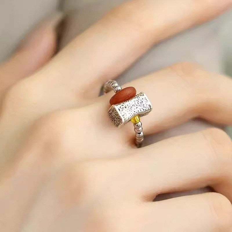 弹力绳小柿子方枕戒指女新中式复古做旧小众个性气质国风开口指环