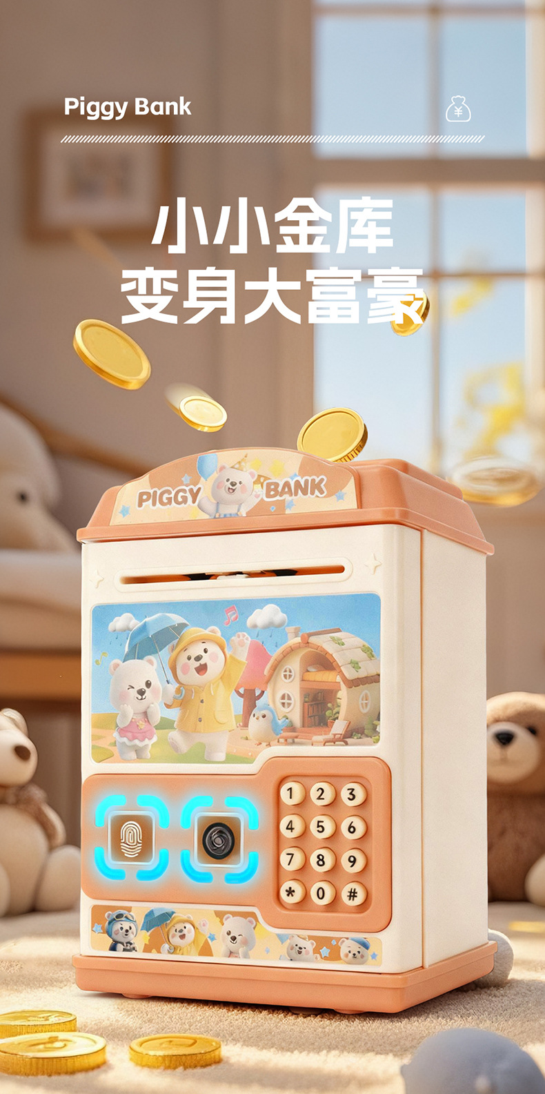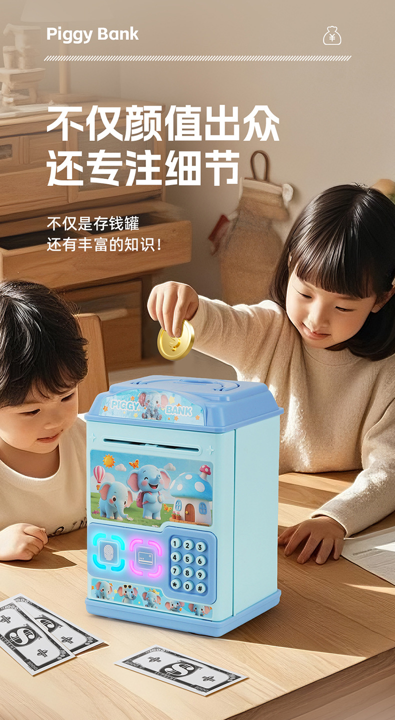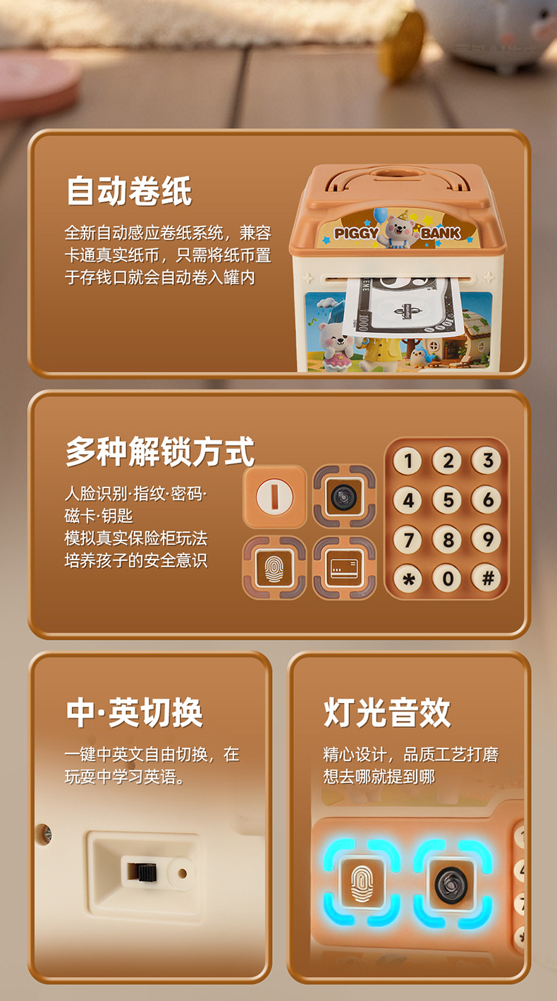 跨境儿童存钱罐自动卷钱指纹密码锁储钱罐电动声光仿真智能存款机